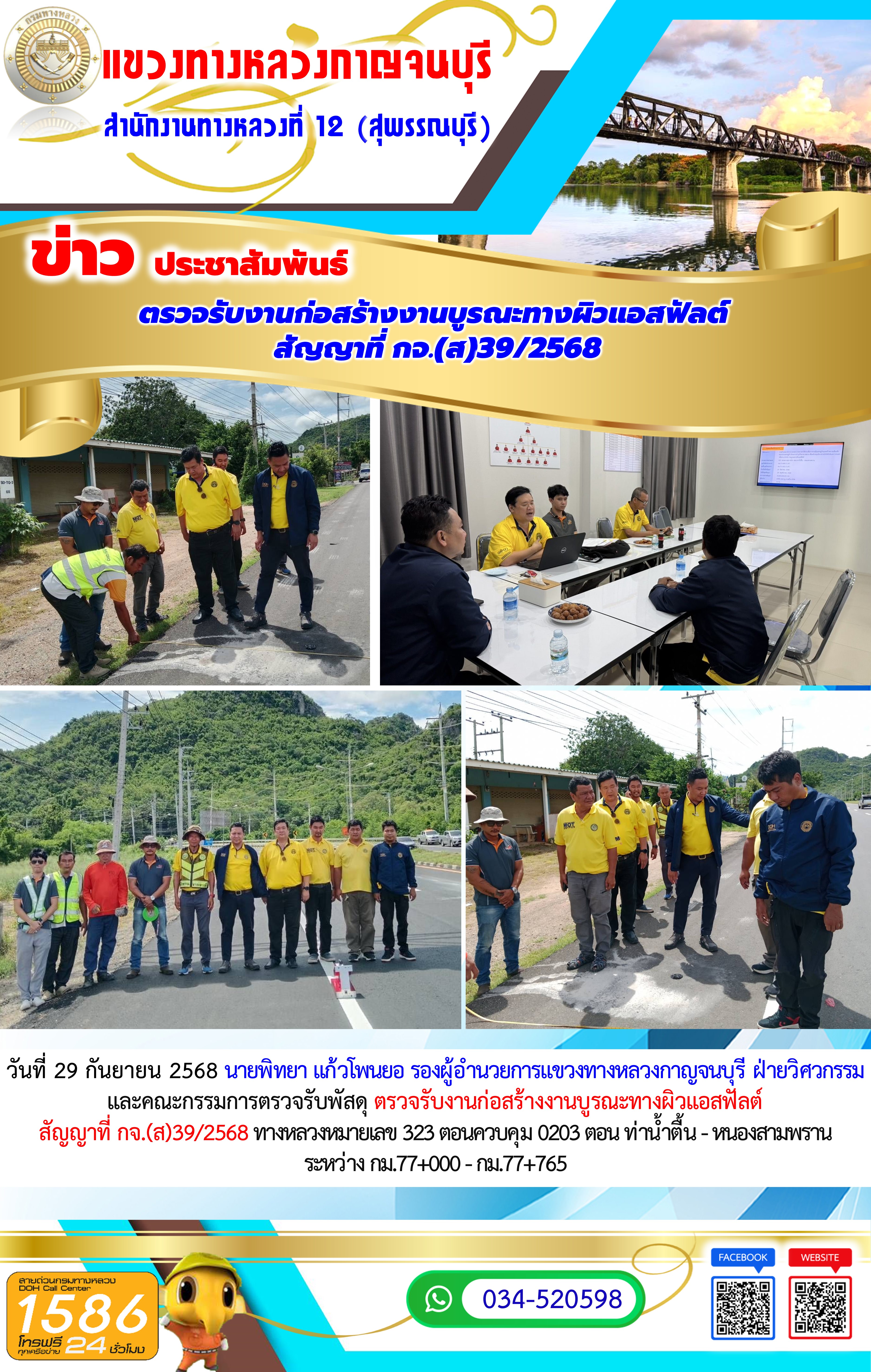 วันที่ 29 กันยายน 2568 นายธนากร สินอิน รองผู้อำนวยการแขวงทางหลวงกาญจนบุรี ฝ่ายปฏิบัติการ และคณะกรรมการตรวจรับพัสดุ ตรวจรับงานก่อสร้างงานบูรณะทางผิวแอสฟัลต์ สัญญาที่ กจ.(ส)58/2568 ทางหลวงหมายเลข 323 ตอนควบคุม 0206 ตอน ทองผาภูมิ – เจดีย์สามองค์ ตอน 1 ระหว่าง กม.236+000 - กม.240+239