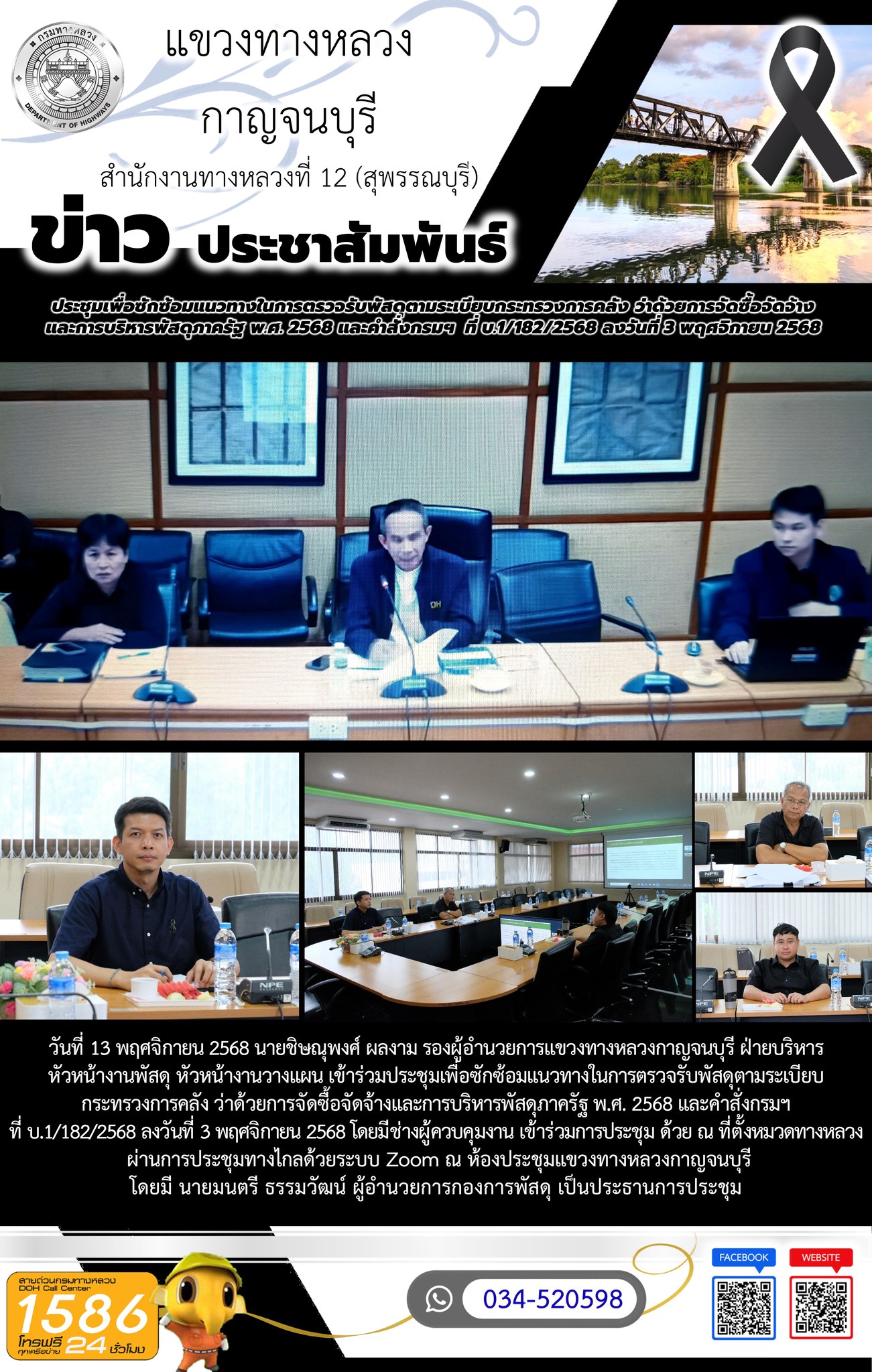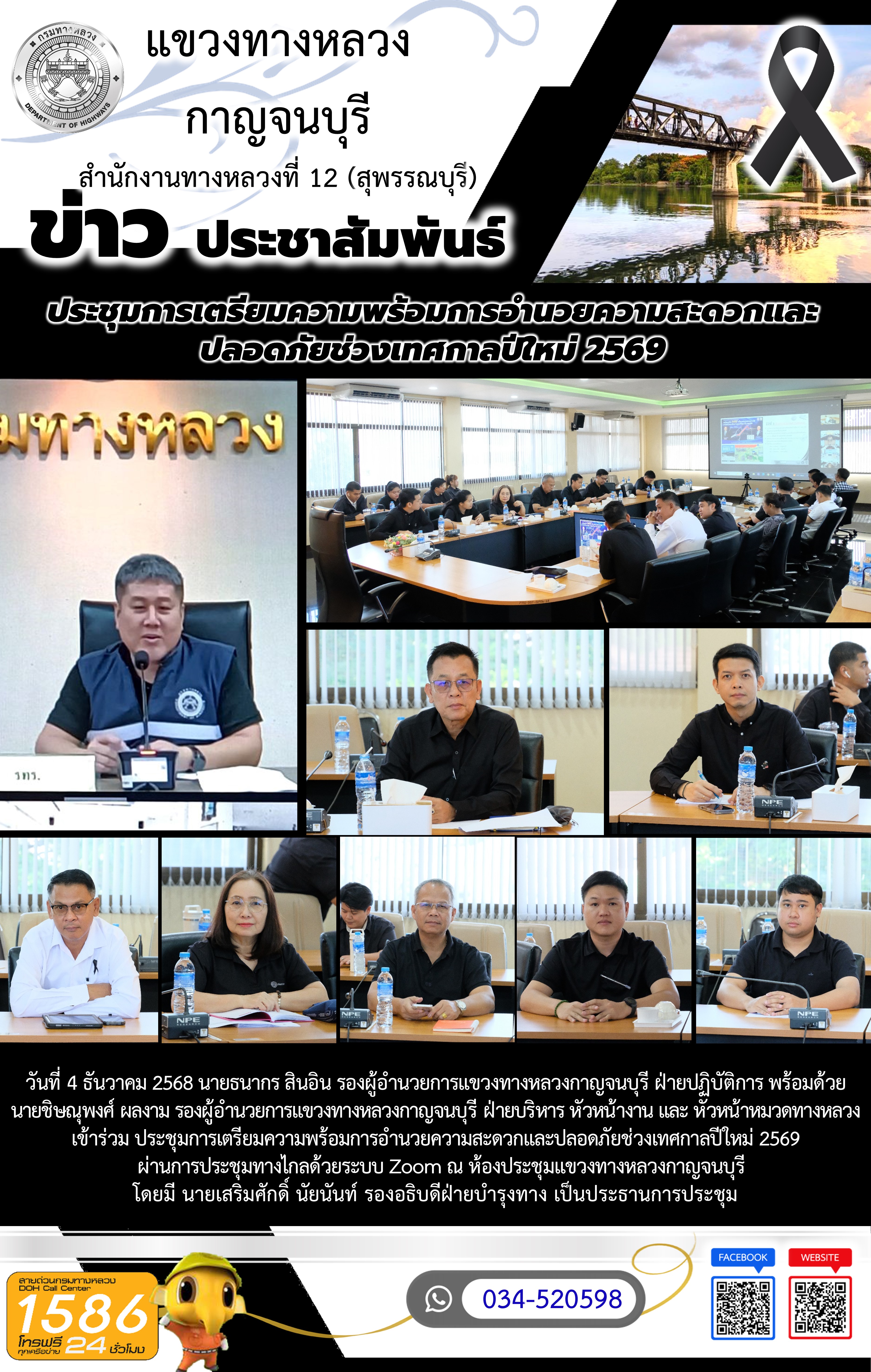 วันที่ 4 ธันวาคม 2568 นายธนากร สินอิน รองผู้อำนวยการแขวงทางหลวงกาญจนบุรี ฝ่ายปฏิบัติการ พร้อมด้วย นายชิษณุพงศ์ ผลงาม รองผู้อำนวยการแขวงทางหลวงกาญจนบุรี ฝ่ายบริหาร หัวหน้างาน และ หัวหน้าหมวดทางหลวง เข้าร่วม ประชุมการเตรียมความพร้อมการอำนวยความสะดวกและปลอดภัยช่วงเทศกาลปีใหม่ 2569 ผ่านการประชุมทางไกลด้วยระบบ Zoom ณ ห้องประชุมแขวงทางหลวงกาญจนบุรี โดยมี นายเสริมศักดิ์ นัยนันท์ รองอธิบดีฝ่ายบำรุงทาง เป็นประธานการประชุม