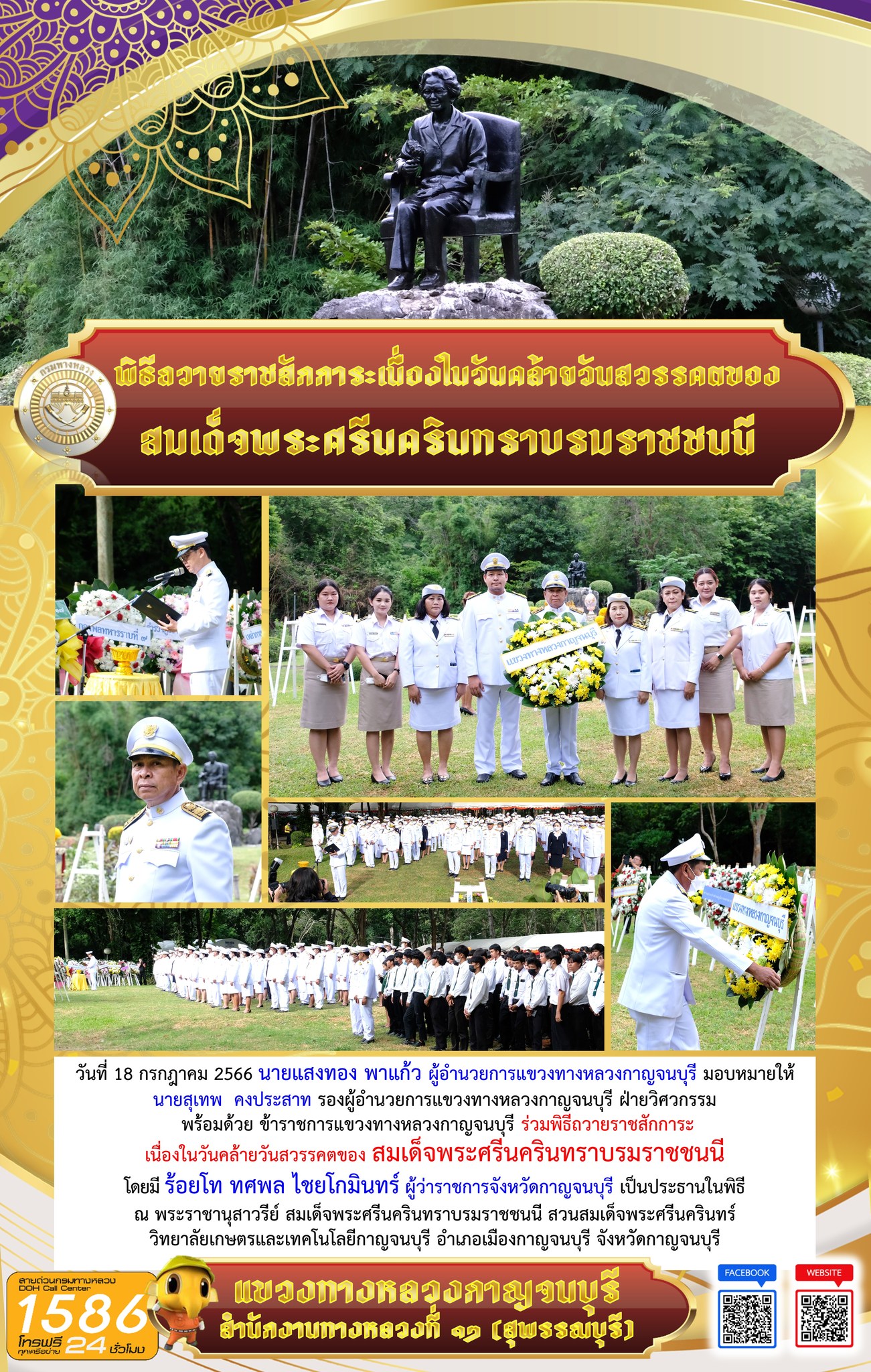 วันที่ 18 กรกฎาคม 2566 นายแสงทอง พาแก้ว ผู้อำนวยการแขวงทางหลวงกาญจนบุรี มอบหมายให้ นายสุเทพ คงประสาท รองผู้อำนวยการแขวงทางหลวงกาญจนบุรี ฝ่ายวิศวกรรม พร้อมด้วย ข้าราชการแขวงทางหลวงกาญจนบุรี ร่วมพิธีถวายราชสักการะ เนื่องในวันคล้ายวันสวรรคตของ สมเด็จพระศรีนครินทราบรมราชชนนี โดยมี ร้อยโท ทศพล ไชยโกมินทร์ ผู้ว่าราชการจังหวัดกาญจนบุรี เป็นประธานในพิธี ณ พระราชานุสาวรีย์ สมเด็จพระศรีนครินทราบรมราชชนนี สวนสมเด็จพระศรีนครินทร์ วิทยาลัยเกษตรและเทคโนโลยีกาญจนบุรี อำเภอเมืองกาญจนบุรี จังหวัดกาญจนบุรี