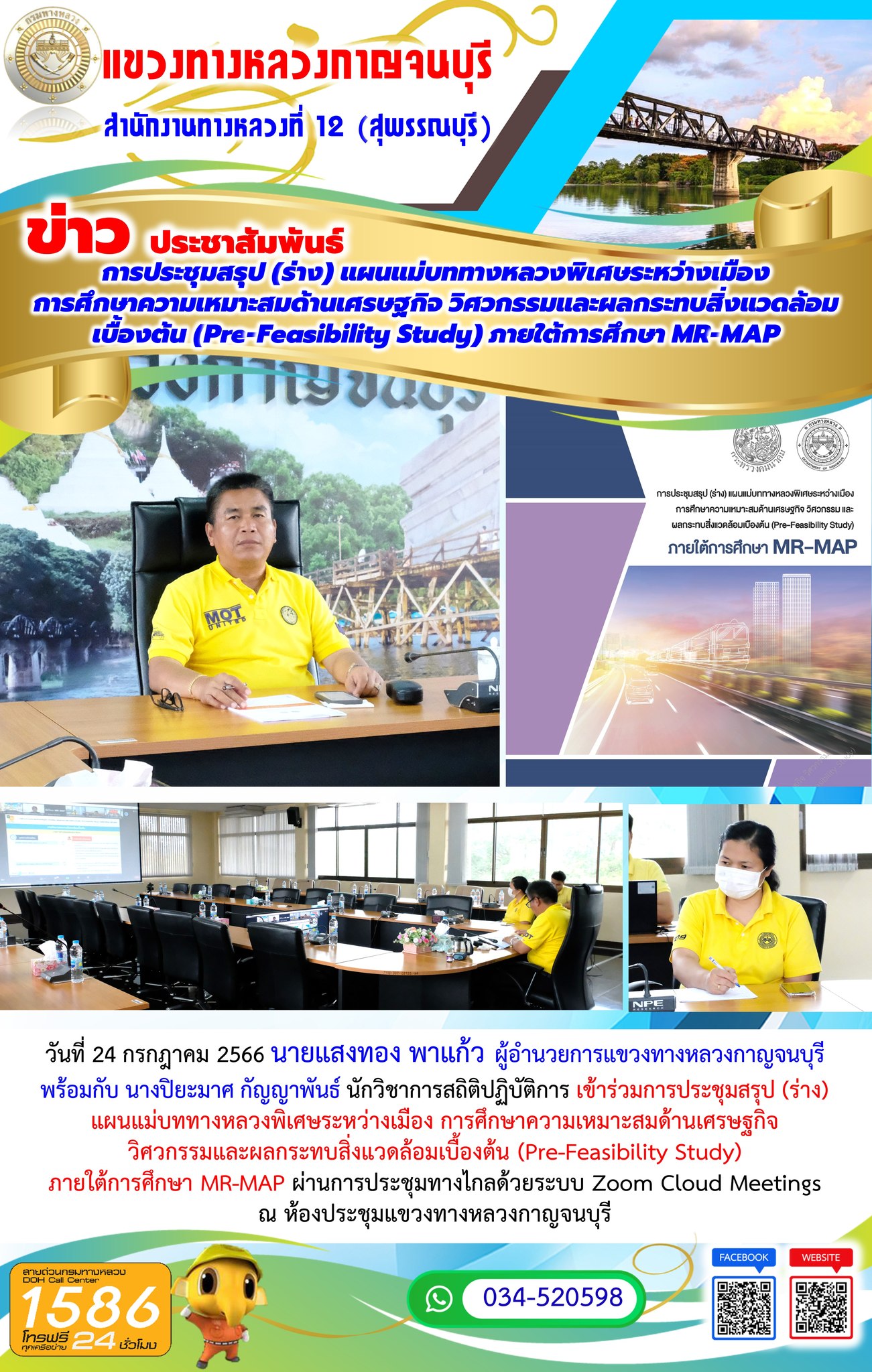 วันที่ 24 กรกฎาคม 2566 นายแสงทอง พาแก้ว ผู้อำนวยการแขวงทางหลวงกาญจนบุรี พร้อมกับ นางปิยะมาศ กัญญาพันธ์ นักวิชาการสถิติปฏิบัติการ เข้าร่วมการประชุมสรุป (ร่าง) แผนแม่บททางหลวงพิเศษระหว่างเมือง การศึกษาความเหมาะสมด้านเศรษฐกิจ วิศวกรรมและผลกระทบสิ่งแวดล้อมเบื้องต้น (Pre-Feasibility Study) ภายใต้การศึกษา MR-MAP ผ่านการประชุมทางไกลด้วยระบบ Zoom Cloud Meetings ณ ห้องประชุมแขวงทางหลวงกาญจนบุรี