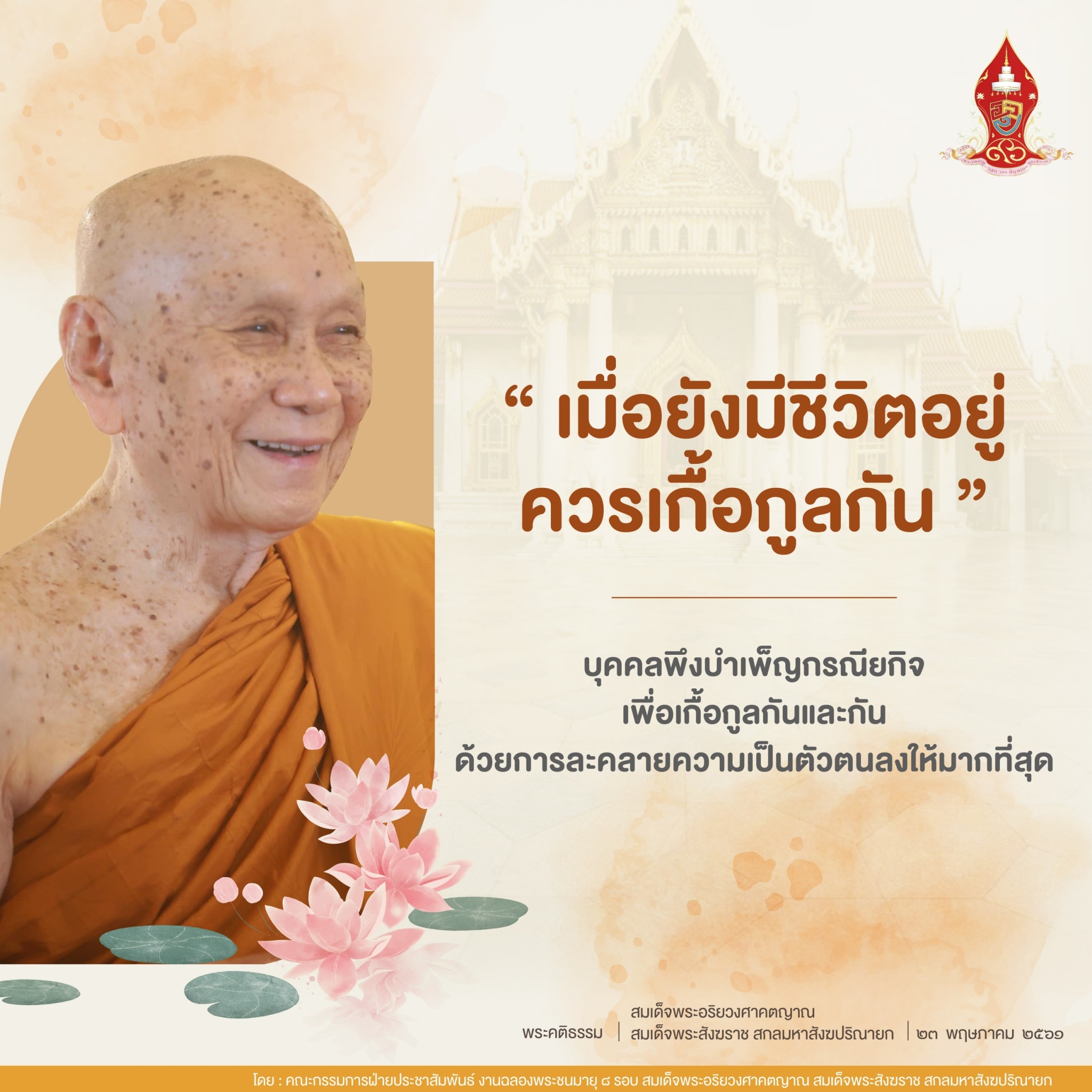 บุคคล ไม่ว่าหมู่ใดเหล่าใด จึงพึงใคร่ครวญอยู่เป็นนิตย์ว่า ชีวิตของตน ไม่ใช่ของยั่งยืนแต่อย่างไร วัยย่อมหมดไปตามลำดับวัย วันและคืนย่อมผ่านไป เมื่อมีชีวิต วัยแห่งชีวิตก็ร่นเข้ามา ด้วยเหตุนี้ บุคคลจึงพึงบำเพ็ญกรณียกิจ เพื่อเกื้อกูลกันและกันด้วยการละคลายความเป็นตัวตนลงให้มากที่สุด ให้สมดังพระพุทธานุศาสนีที่ว่า "เมื่อยังมีชีวิตอยู่ ควรเกื้อกูลกัน"