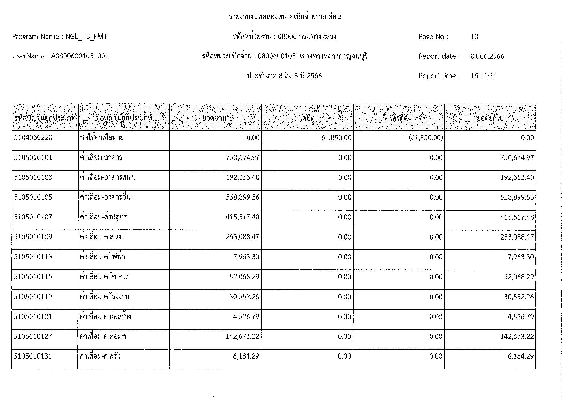 รายงานงบทดลองหน่วยเบิกจ่ายรายเดือน ประจำงวด 8 ประจำปีที่ 2566