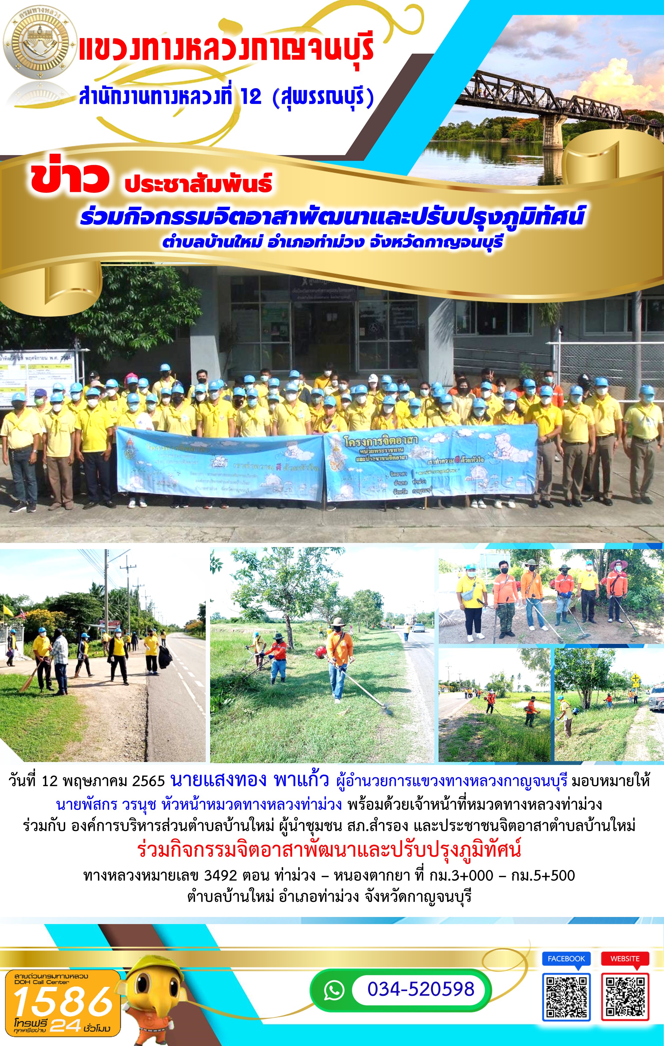 วันที่ 12 พฤษภาคม 2565 นายแสงทอง พาแก้ว ผู้อำนวยการแขวงทางหลวงกาญจนบุรี มอบหมายให้ นายพัสกร วรนุช หัวหน้าหมวดทางหลวงท่าม่วง พร้อมด้วยเจ้าหน้าที่หมวดทางหลวงท่าม่วง ร่วมกับ องค์การบริหารส่วนตำบลบ้านใหม่ ผู้นำชุมชน สภ.สำรอง และประชาชนจิตอาสาตำบลบ้านใหม่ ร่วมกิจกรรมจิตอาสาพัฒนาและปรับปรุงภูมิทัศน์ ทางหลวงหมายเลข 3492 ตอน ท่าม่วง – หนองตากยา ที่ กม.3+000 – กม.5+500 ตำบลบ้านใหม่ อำเภอท่าม่วง จังหวัดกาญจนบุรี