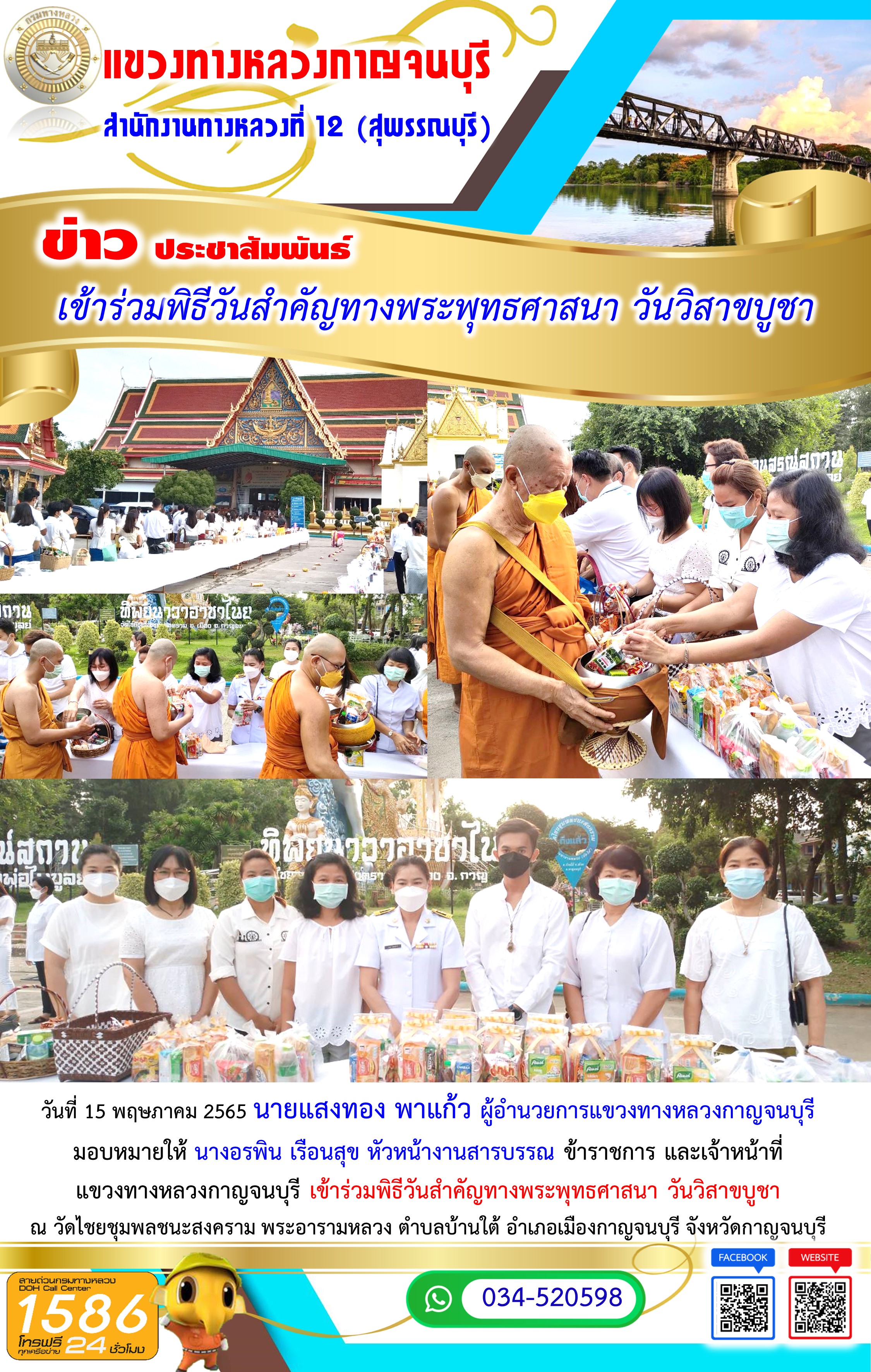 วันที่ 15 พฤษภาคม 2565 นายแสงทอง พาแก้ว ผู้อำนวยการแขวงทางหลวงกาญจนบุรี มอบหมายให้ นางอรพิน เรือนสุข หัวหน้างานสารบรรณ ข้าราชการ และเจ้าหน้าที่แขวงทางหลวงกาญจนบุรี เข้าร่วมพิธีวันสำคัญทางพระพุทธศาสนา วันวิสาขบูชา ณ วัดไชยชุมพลชนะสงคราม พระอารามหลวง ตำบลบ้านใต้ อำเภอเมืองกาญจนบุรี จังหวัดกาญจนบุรี