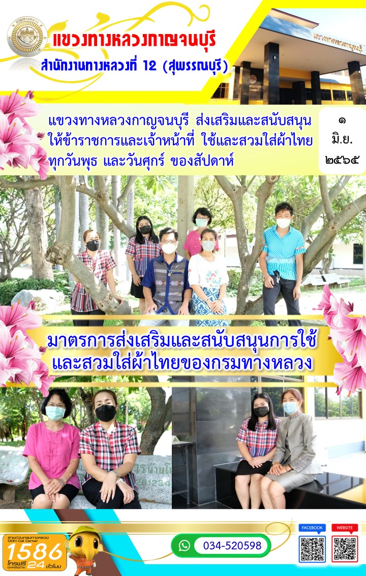 วันที่ 18 พ.ค. 2565 แขวงทางหลวงกาญจนบุรี รณรงค์แต่งกายด้วยผ้าไทย เพื่อส่งเสริมและสนับสนุนการใช้และสวมใส่ผ้าไทย เป็นการอนุรักษ์และสืบสานภูมิปัญญาของไทย สร้างค่านิยมและการตระหนักรับรู้การรักษามรดกและอัตลักษณ์ภูมิปัญญาของไทย