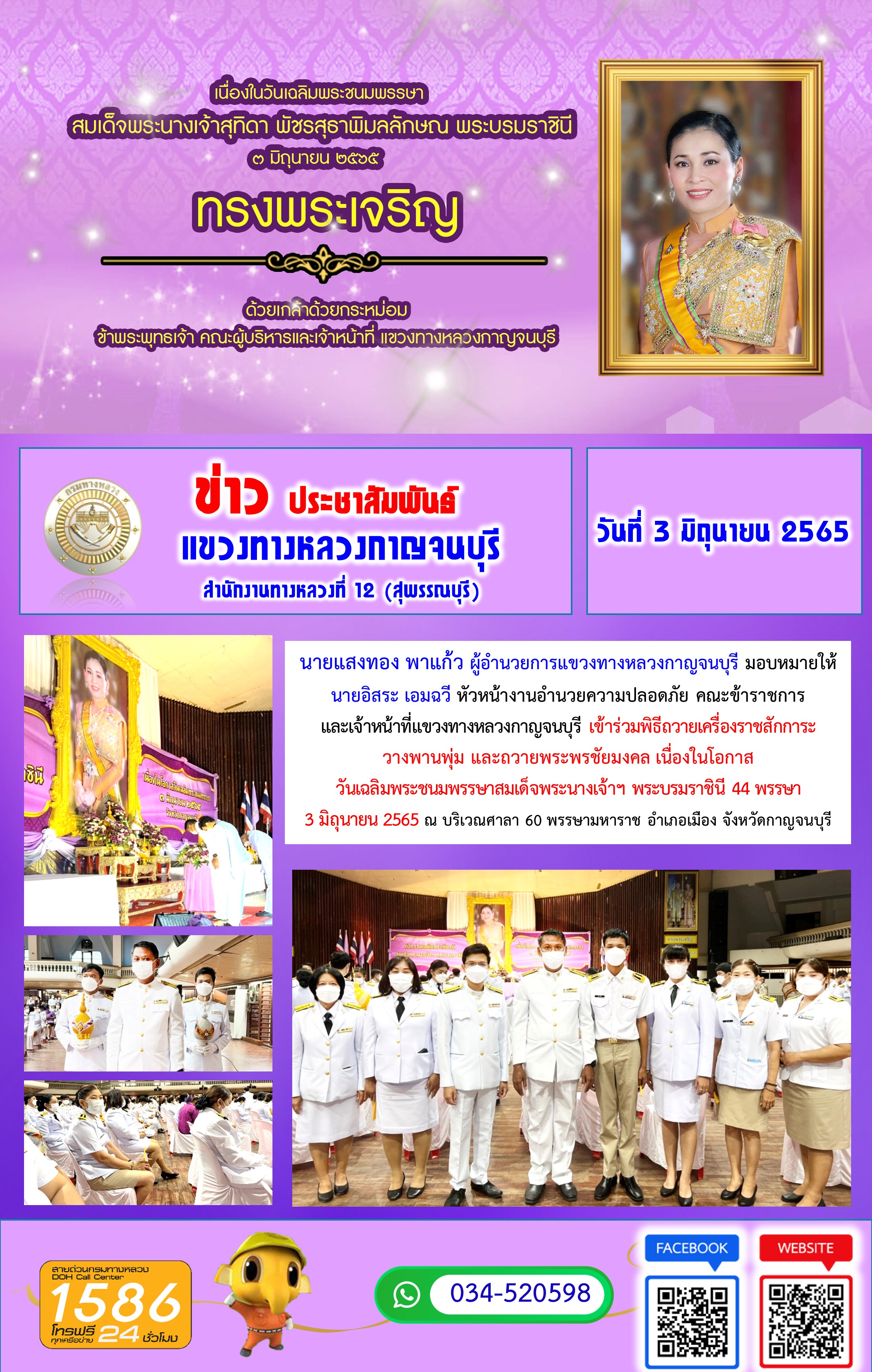 วันที่ 3 มิถุนายน 2565 นายแสงทอง พาแก้ว ผู้อำนวยการแขวงทางหลวงกาญจนบุรี มอบหมายให้ นายอิสระ เอมฉวี หัวหน้างานอำนวยความปลอดภัย คณะข้าราชการ และเจ้าหน้าที่ แขวงทางหลวงกาญจนบุรี เข้าร่วมพิธีถวายเครื่องราชสักการะ วางพานพุ่ม และถวายพระพรชัยมงคล เนื่องในโอกาสวันเฉลิมพระชนมพรรษาสมเด็จพระนางเจ้าฯ พระบรมราชินี 44 พรรษา 3 มิถุนายน 2565 ณ บริเวณศาลา 60 พรรษามหาราช อำเภอเมือง จังหวัดกาญจนบุรี