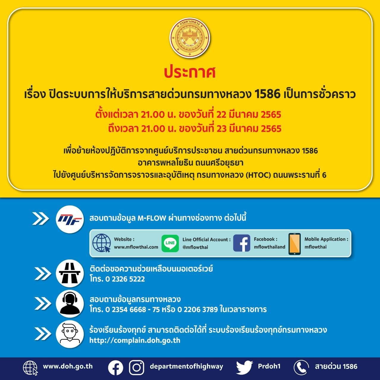 กรมทางหลวงแจ้งปิดให้บริการสายด่วน 1586 ชั่วคราว ตั้งแต่เวลา 21.00 น. ของวันที่ 22 มีนาคม 2565