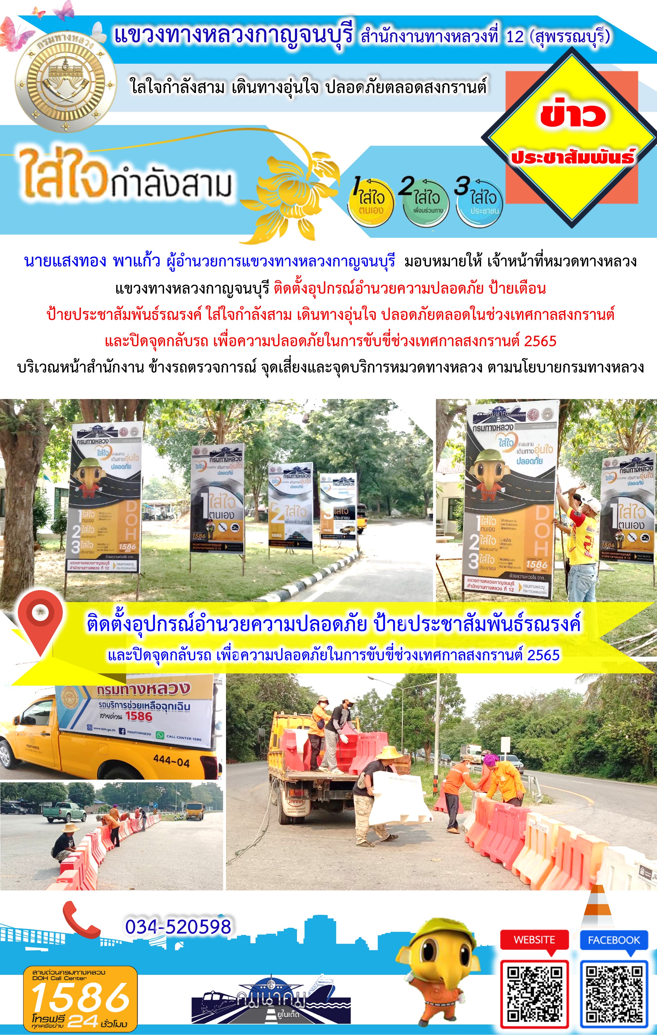 นายแสงทอง พาแก้ว ผู้อำนวยการแขวงทางหลวงกาญจนบุรี มอบหมายให้ เจ้าหน้าที่หมวดทางหลวง แขวงทางหลวงกาญจนบุรี ติดตั้งอุปกรณ์อำนวยความปลอดภัย ป้ายเตือน ป้ายประชาสัมพันธ์รณรงค์ ใส่ใจกำลังสาม เดินทางอุ่นใจ ปลอดภัยตลอดในช่วงเทศกาลสงกรานต์ และปิดจุดกลับรถ เพื่อความปลอดภัยในการขับขี่ช่วงเทศกาลสงกรานต์ 2565 บริเวณหน้าสำนักงาน ข้างรถตรวจการณ์ จุดเสี่ยงและจุดบริการหมวดทางหลวง ตามนโยบายกรมทางหลวง