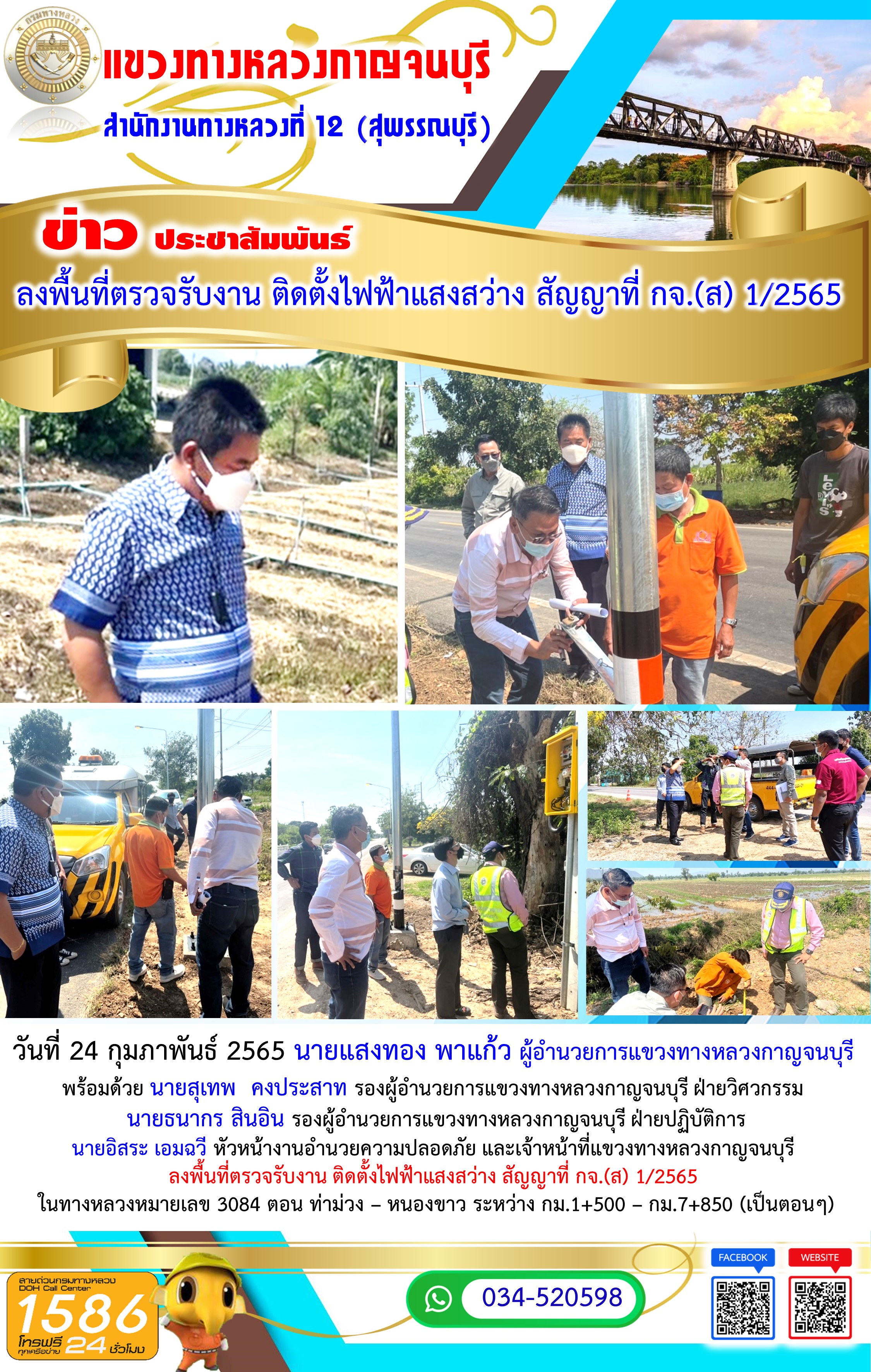 วันที่ 24 กุมภาพันธ์ 2565 นายแสงทอง พาแก้ว ผู้อำนวยการแขวงทางหลวงกาญจนบุรี พร้อมด้วย นายสุเทพ คงประสาท รองผู้อำนวยการแขวงทางหลวงกาญจนบุรี ฝ่ายวิศวกรรม นายธนากร สินอิน รองผู้อำนวยการแขวงทางหลวงกาญจนบุรี ฝ่ายปฏิบัติการ นายอิสระ เอมฉวี หัวหน้างานอำนวยความปลอดภัย และเจ้าหน้าที่แขวงทางหลวงกาญจนบุรี ลงพื้นที่ตรวจรับงาน ติดตั้งไฟฟ้าแสงสว่าง สัญญาที่ กจ.(ส) 1/2565 ในทางหลวงหมายเลข 3084 ตอน ท่าม่วง – หนองขาว ระหว่าง กม.1+500 – กม.7+850 (เป็นตอนๆ)