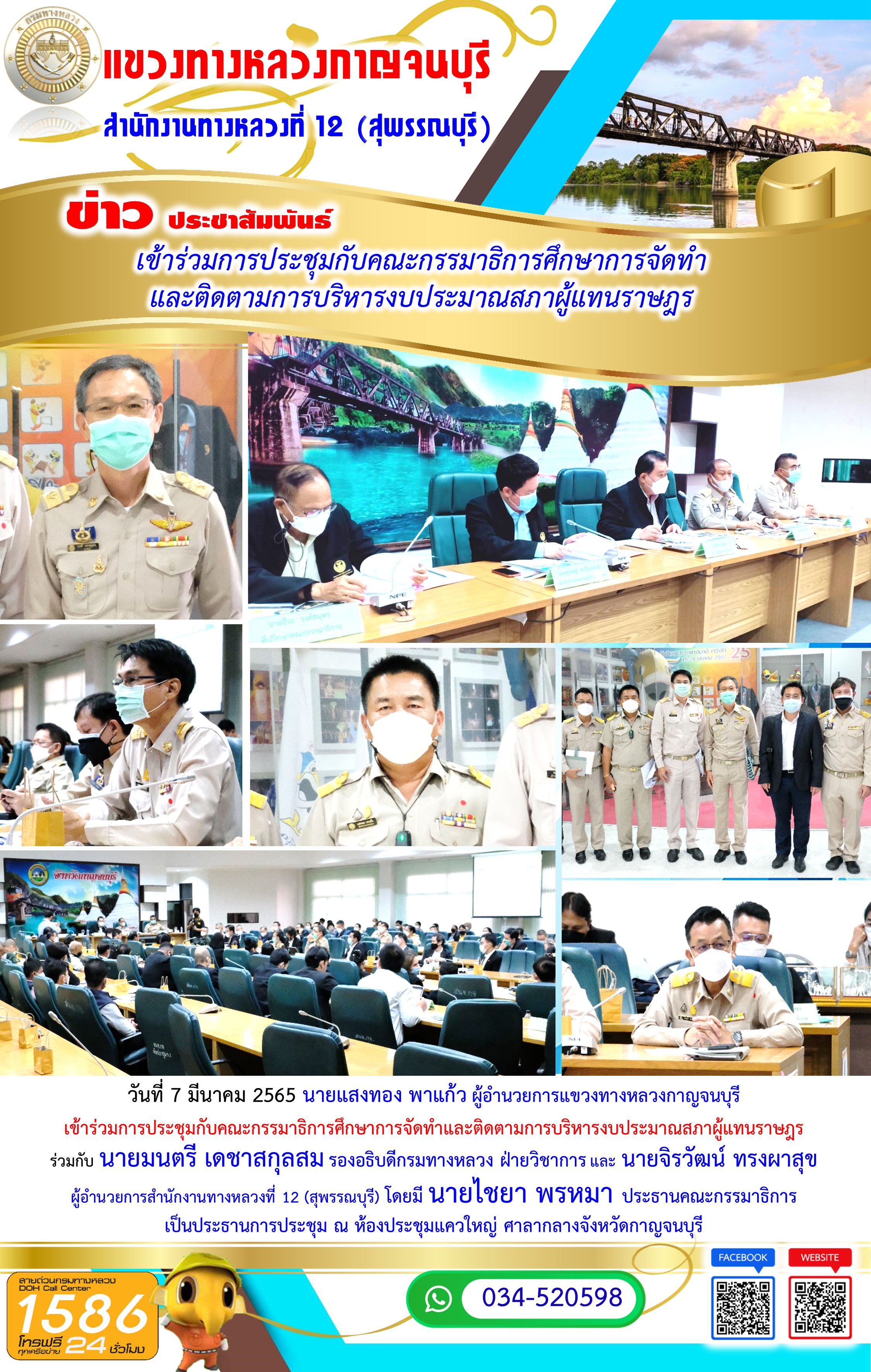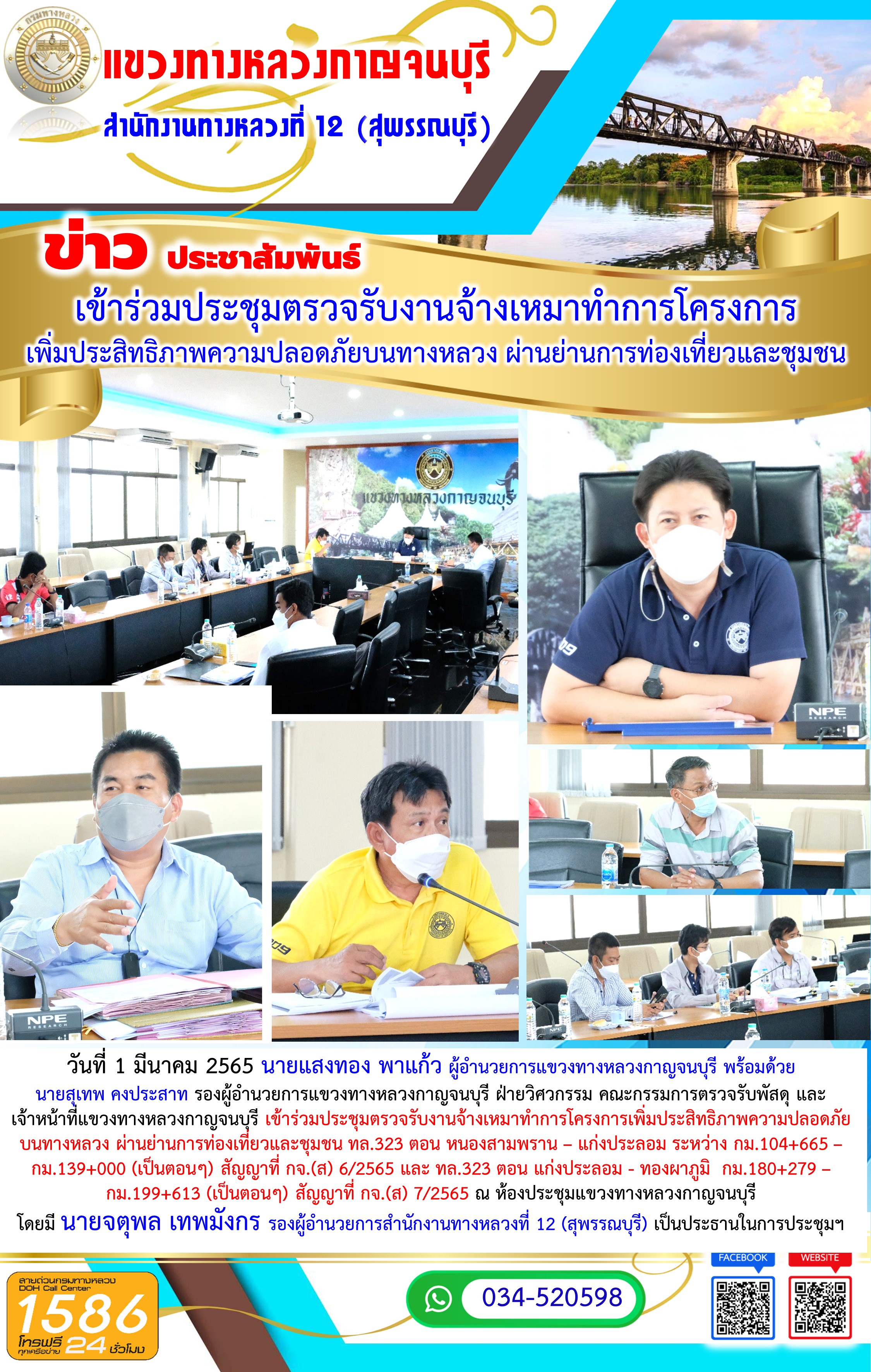 เข้าร่วมประชุมตรวจรับงานจ้างเหมาทำการโครงการเพิ่มประสิทธิภาพความปลอดภัยบนทางหลวง ผ่านย่านการท่องเที่ยวและชุมชน ทล.323 ตอน หนองสามพราน – แก่งประลอม ระหว่าง กม.104+665 – กม.139+000 (เป็นตอนๆ) สัญญาที่ กจ.(ส) 6/2565 และ ทล.323 ตอน แก่งประลอม - ทองผาภูมิ กม.180+279 – กม.199+613 (เป็นตอนๆ) สัญญาที่ กจ.(ส) 7/2565 ณ ห้องประชุมแขวงทางหลวงกาญจนบุรี โดยมี นายจตุพล เทพมังกร รองผู้อำนวยการสำนักงานทางหลวงที่ 12 (สุพรรณบุรี) เป็นประธานในการประชุมฯ