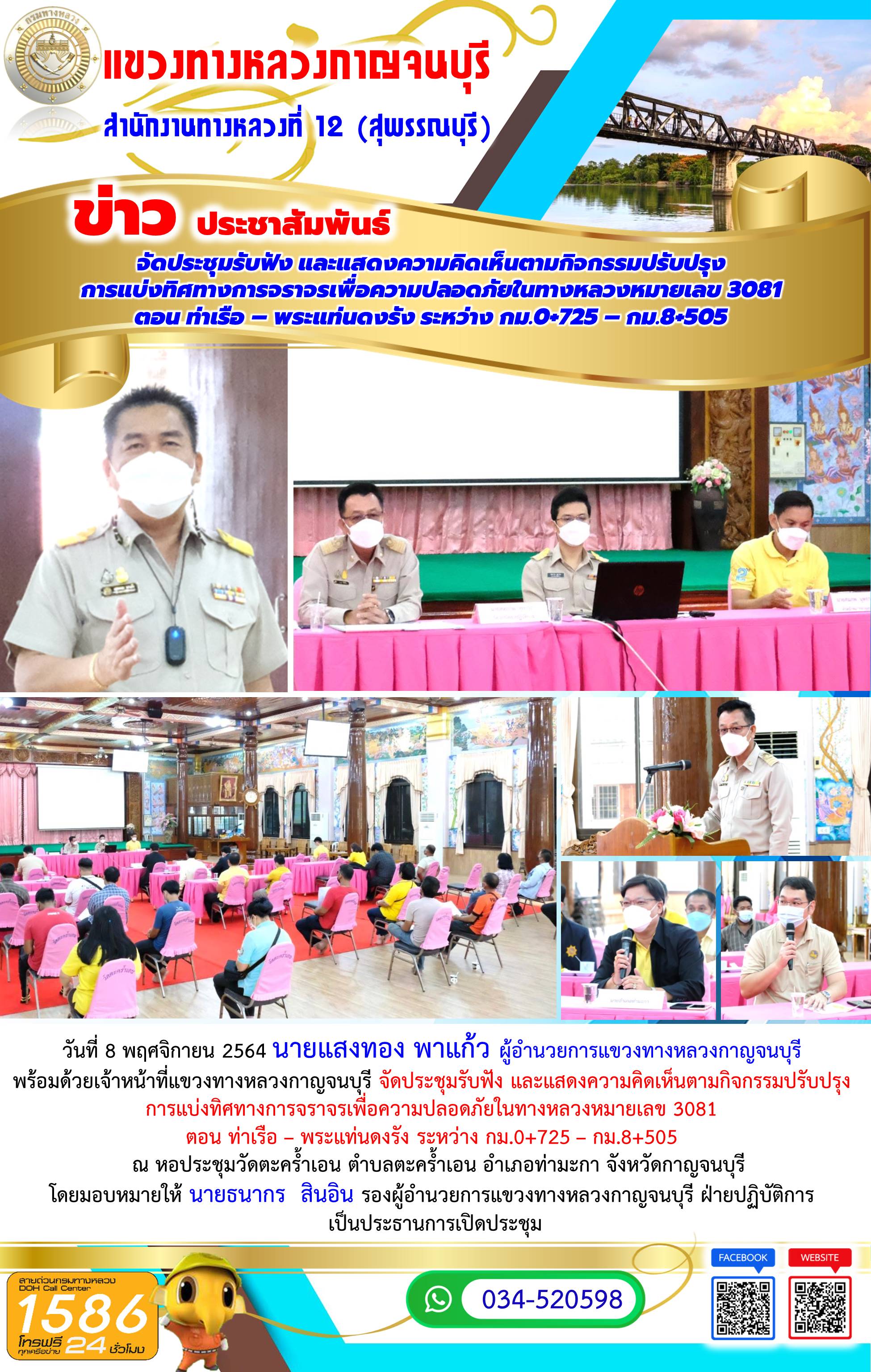 344 09/11/2564 วันที่ 8 พฤศจิกายน 2564 นายแสงทอง พาแก้ว ผู้อำนวยการแขวงทางหลวงกาญจนบุรี พร้อมด้วยเจ้าหน้าที่แขวงทางหลวงกาญจนบุรี จัดประชุมรับฟัง และแสดงความคิดเห็นตามกิจกรรมปรับปรุงการแบ่งทิศทางการจราจรเพื่อความปลอดภัย ในทางหลวงหมายเลข 3081 ตอน ท่าเรือ – พระแท่นดงรัง ระหว่าง กม.0+725 – กม.8+505 ณ หอประชุมวัดตะคร้ำเอน ตำบลตะคร้ำเอน อำเภอท่ามะกา จังหวัดกาญจนบุรี โดยมอบหมายให้ นายธนากร สินอิน รองผู้อำนวยการแขวงทางหลวงกาญจนบุรี ฝ่ายปฏิบัติการ เป็นประธานการเปิดประชุม
