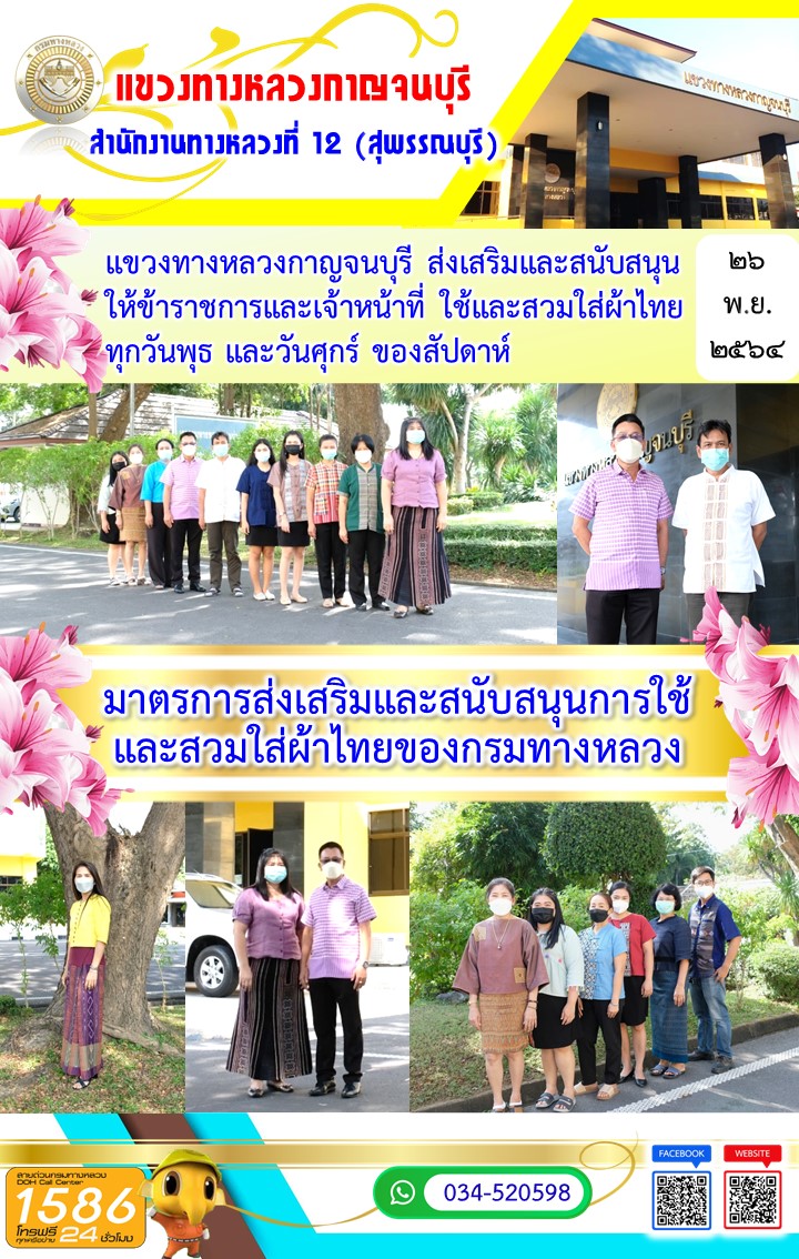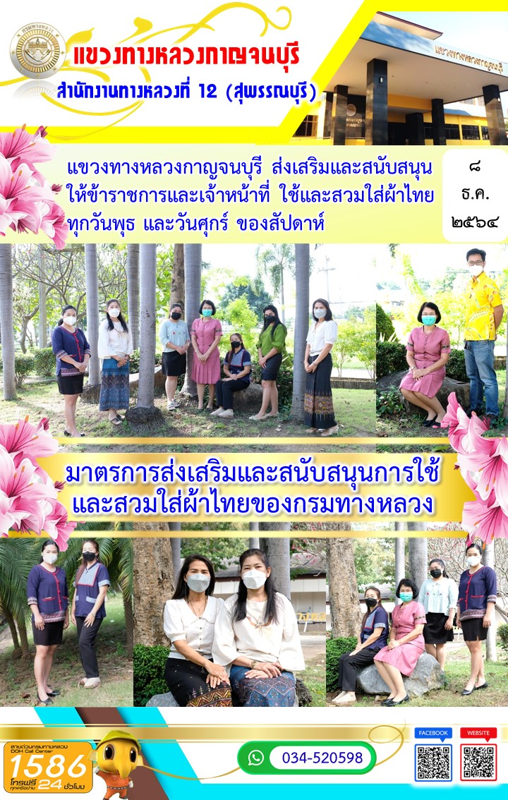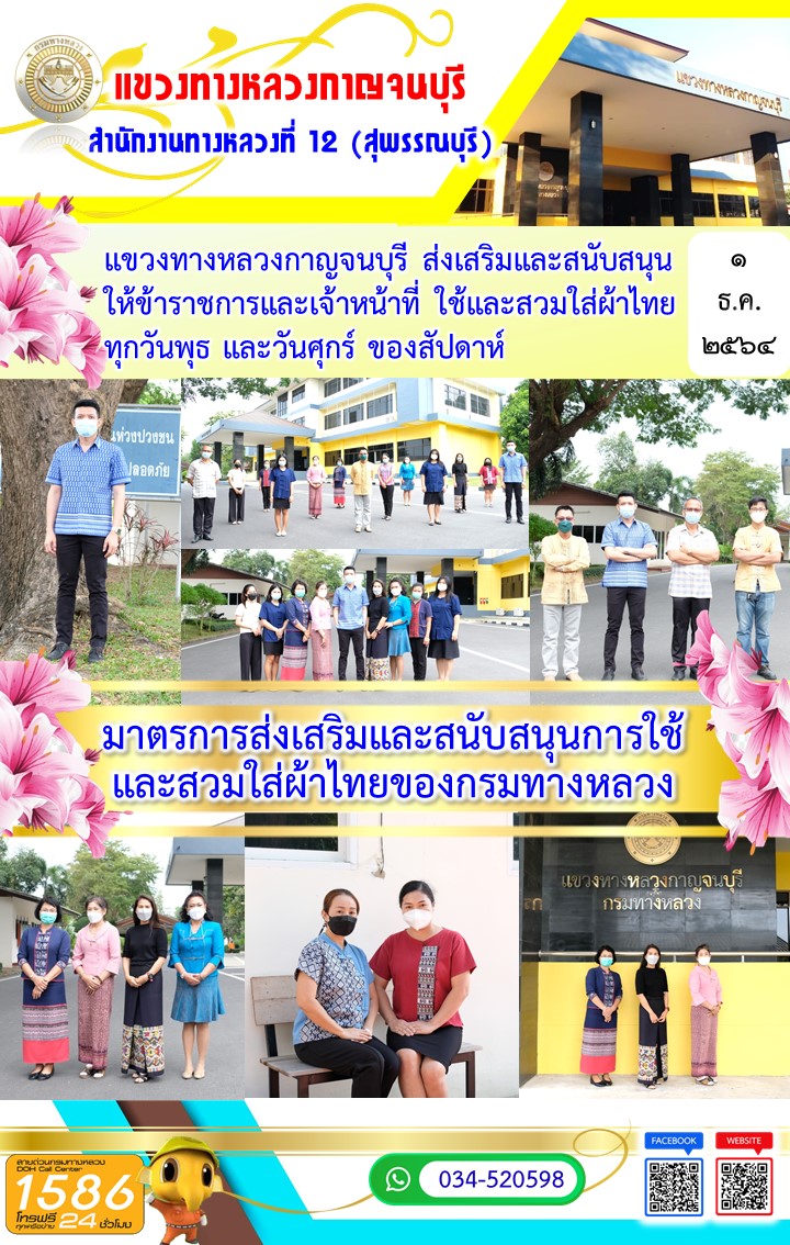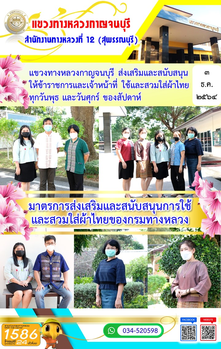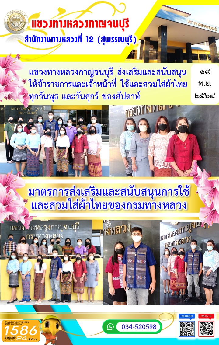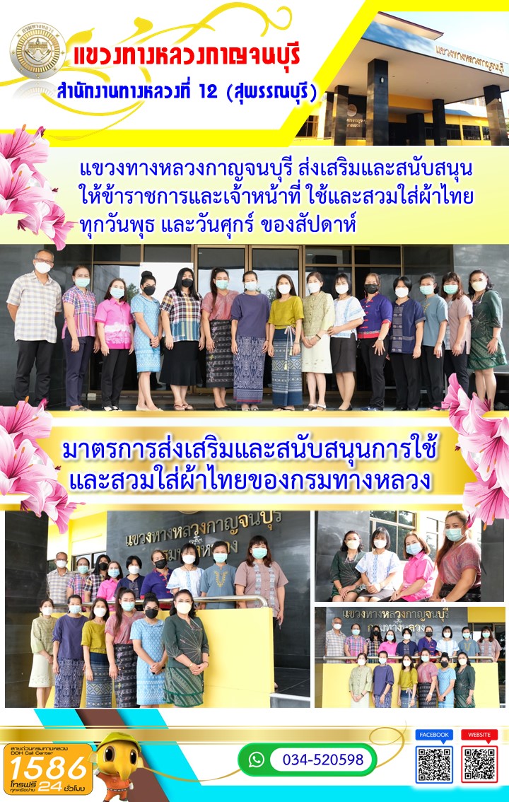342 17/11/2564 แขวงทางหลวงกาญจนบุรีรณรงค์แต่งกายด้วยผ้าไทยเพื่อส่งเสริมและสนับสนุนการใช้และสวมใส่ผ้าไทย เป็นการอนุรักษ์และสืบสานภูมิปัญญาของไทย สร้างค่านิยมและการตระหนักรับรู้การรักษามรดกและอัตลักษณ์ภูมิปัญญาของไทย #กรมทางหลวง #สายด่วนกรมทางหลวง1586 #แขวงทางหลวงกาญจนบุรี โทร 034-520-598