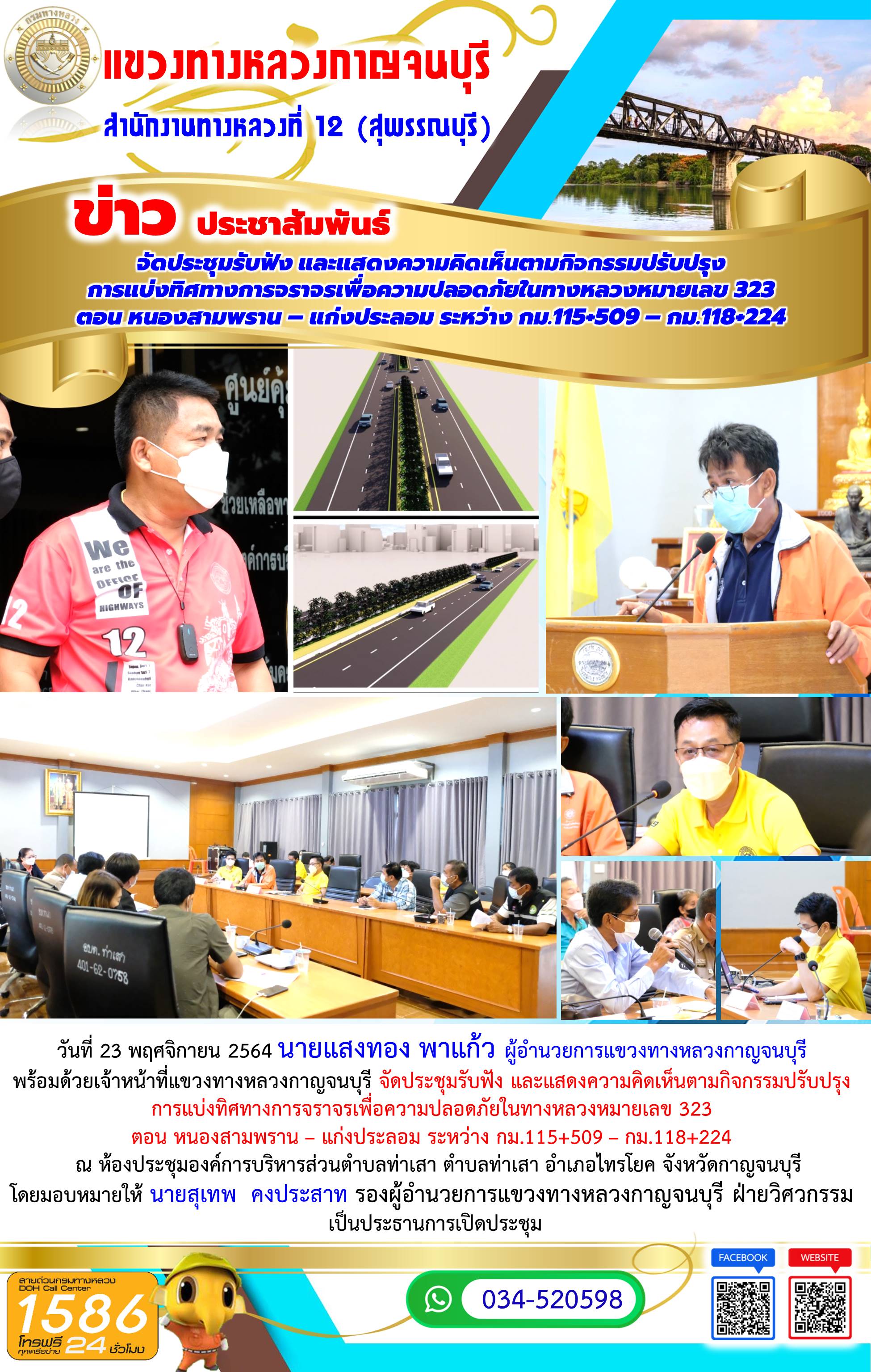 340 23/11/2564 จัดประชุมรับฟัง และแสดงความคิดเห็นตามกิจกรรมปรับปรุง การแบ่งทิศทางการจราจรเพื่อความปลอดภัยในทางหลวงหมายเลข 323 ตอน หนองสามพราน – แก่งประลอม ระหว่าง กม.115+509 – กม.118+224