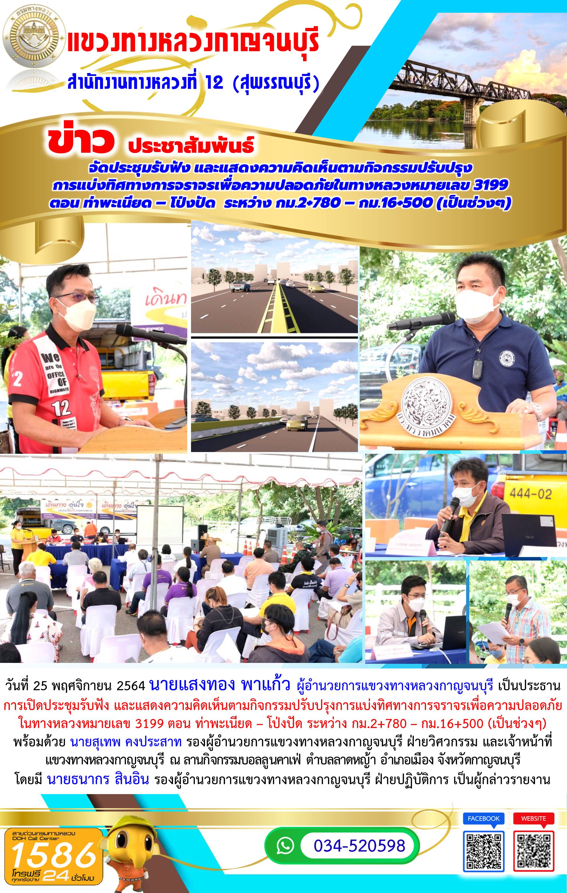 338 25/11/2564 จัดประชุมรับฟัง และแสดงความคิดเห็นตามกิจกรรมปรับปรุง การแบ่งทิศทางการจราจรเพื่อความปลอดภัยในทางหลวงหมายเลข 3199 ตอน ท่าพะเนียด – โป่งปัด ระหว่าง กม.2+780 – กม.16+500 (เป็นช่วงๆ)