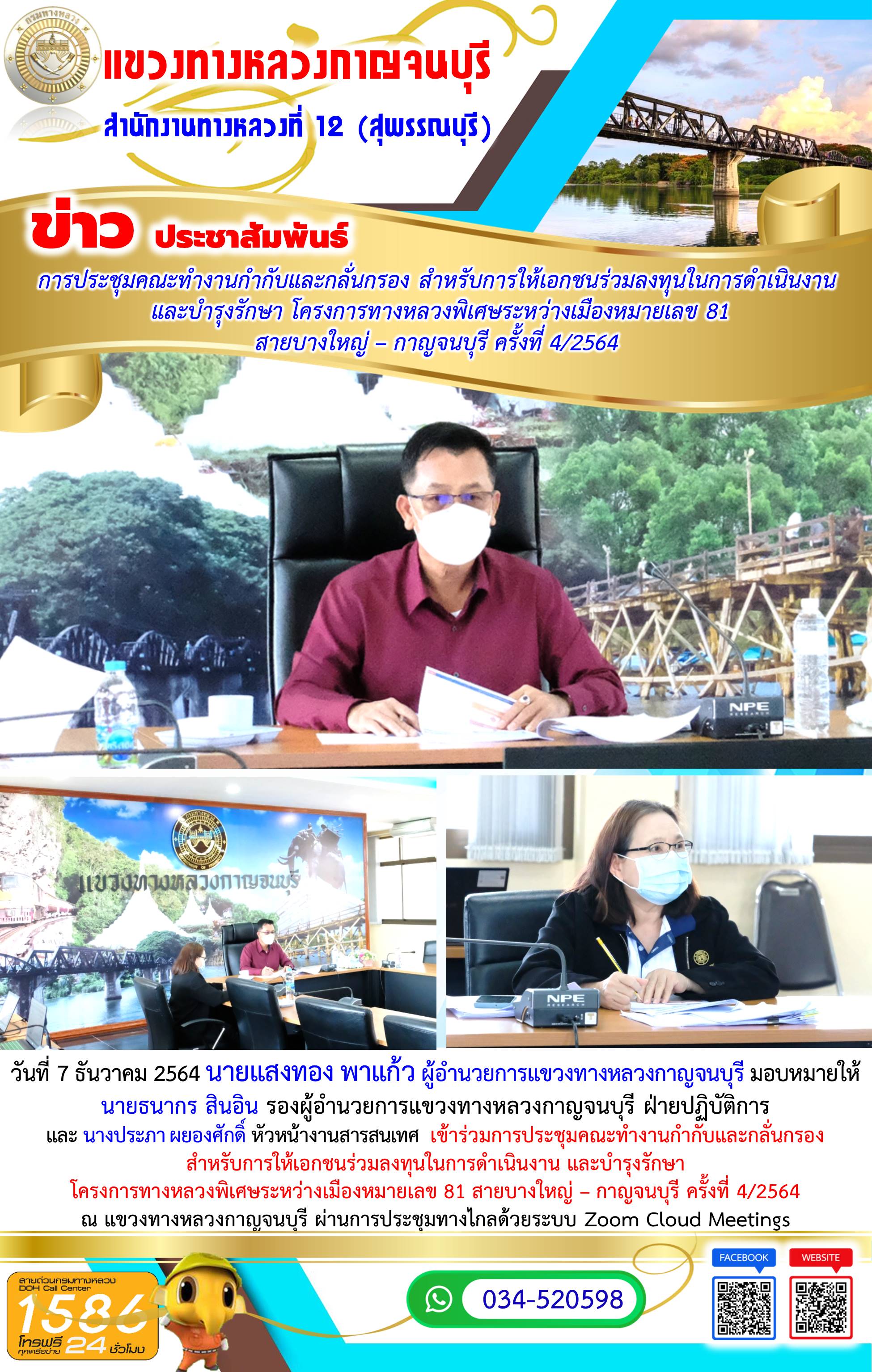 333 08/12/2564 เข้าร่วมการประชุมคณะทำงานกำกับและกลั่นกรอง สำหรับการให้เอกชนร่วมลงทุนในการดำเนินงาน และบำรุงรักษา โครงการทางหลวงพิเศษระหว่างเมืองหมายเลข 81 สายบางใหญ่ – กาญจนบุรี ครั้งที่ 4/2564