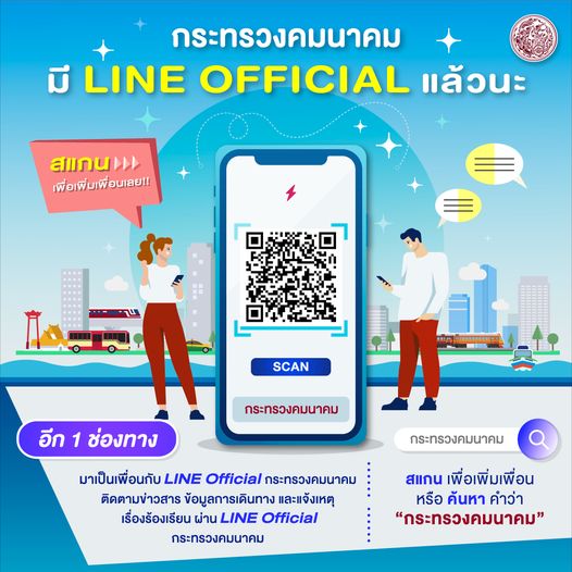 332 08/12/2564 ประชาสัมพันธ์ เชิญชวน ประชาชน Add Line Official กระทรวงคมนาคม เพื่อเป็นช่องทาง ติดตามข้อมูลข่าวสาร ประชาสัมพันธ์ ที่ถูกต้องและรวดเร็วจากภาครัฐโดยตรง รวมทั้งเป็นศูนย์กลางการติดต่อหน่วยงานต่างๆ ในสังกัดกระทรวงฯ และอำนวยความสะดวกประชาชน ในการแจ้งเหตุ และเรื่องร้องเรียน ด้านคมนาคมขนส่ง แอดติดตามได้ที่สแกน QR code หรือ พิมพ์ค้นหาบัญชีทางการ “กระทรวงคมนาคม” #กรมทางหลวง #สายด่วนกรมทางหลวง1586 #แขวงทางหลวงกาญจนบุรี โทร 034-520-598