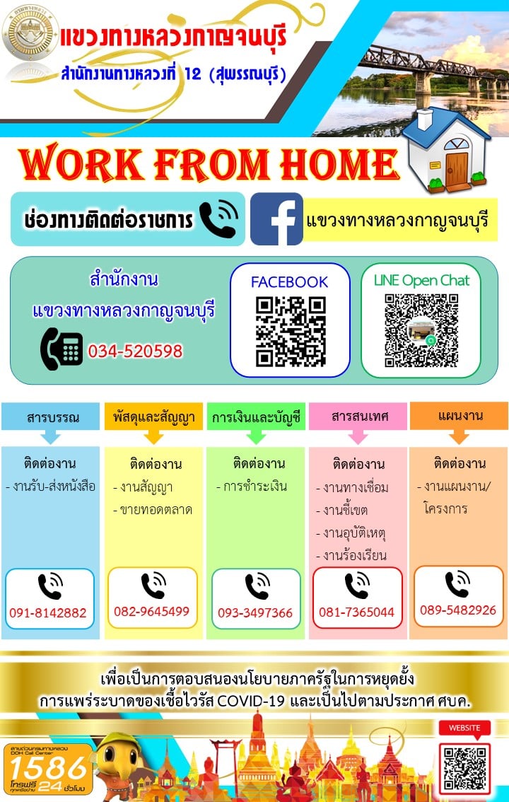 ประชาสัมพันธ์ แขวงทางหลวงกาญจนบุรีได้ดำเนินการ work from home ตามประกาศของ ศบค. เพื่อลดการระบาดของเชื้อไวรัส COVID-19 จนกว่าจะมีประกาศเปลี่ยนแปลง เพื่อความสะดวกและรวดเร็วท่านสามารถติดต่อราชการในวันและเวลาราชการตามช่องทางด้านล่างนี้ #กรมทางหลวง #สายด่วนกรมทางหลวง1586 #แขวงทางหลวงกาญจนบุรี โทร 034-520-598