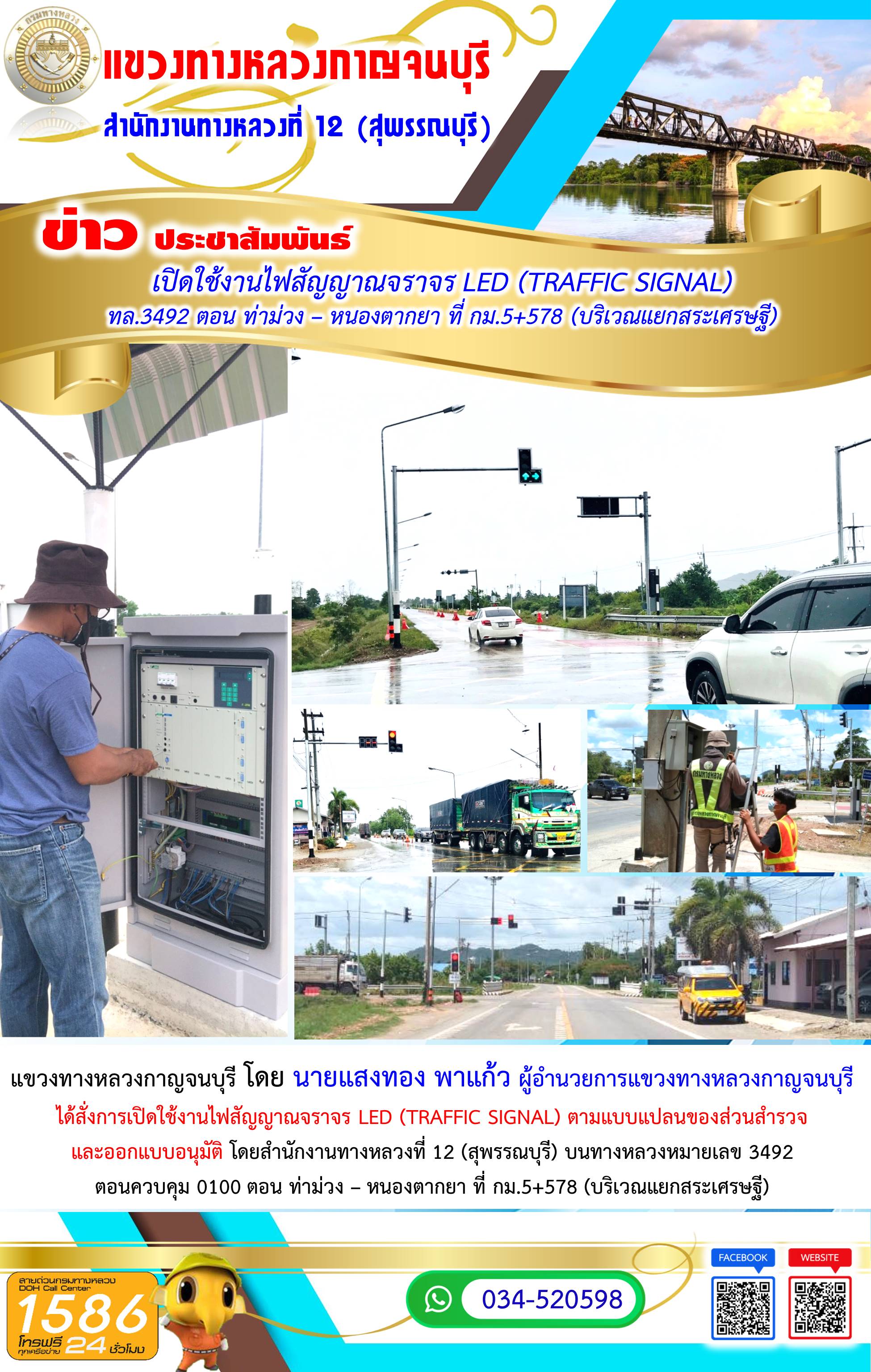 แขวงทางหลวงกาญจนบุรี โดย นายแสงทอง พาแก้ว ผู้อำนวยการแขวงทางหลวงกาญจนบุรี ได้สั่งการเปิดใช้งานไฟสัญญาณจราจร LED (TRAFFIC SIGNAL) ตามแบบแปลนของส่วนสำรวจ และออกแบบอนุมัติ โดยสำนักงานทางหลวงที่ 12 (สุพรรณบุรี) บนทางหลวงหมายเลข 3492 ตอนควบคุม 0100 ตอน ท่าม่วง – หนองตากยา ที่ กม.5+578 (บริเวณแยกสระเศรษฐี)