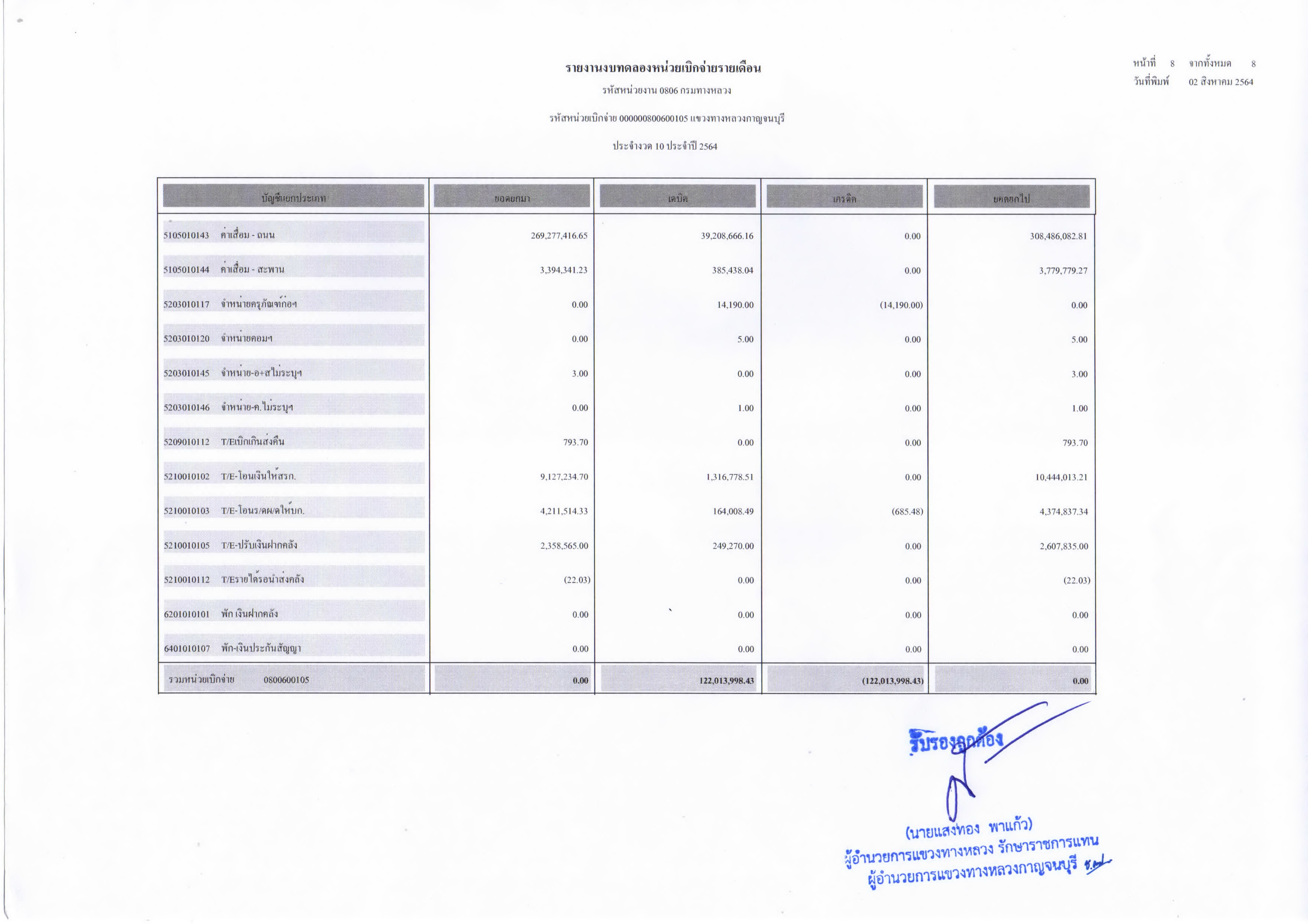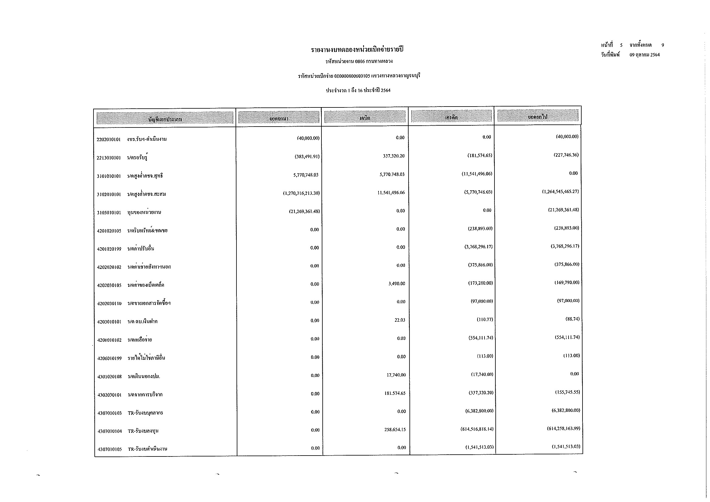 รายงานงบทดลองหน่วยเบิกจ่ายรายปี ประจำงวด 1 ถึง 16 ประจำปีที่ 2564 และ รายละเอียดประกอบรายการบัญชีที่สำคัญของงบทดลอง กรมทางหลวง แขวงทางหลวงกาญจนบุรี ณวันที่ 30 กันยายน 2564