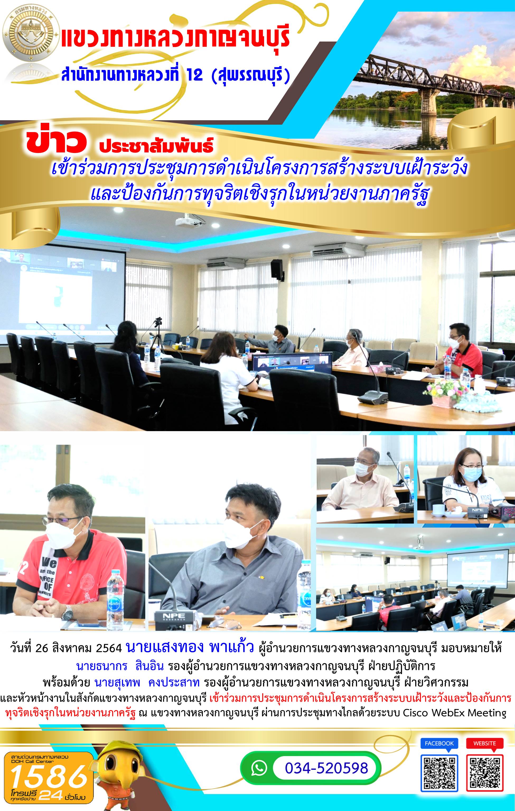 วันที่ 26 สิงหาคม 2564 นายแสงทอง พาแก้ว ผู้อำนวยการแขวงทางหลวงกาญจนบุรี มอบหมายให้ นายธนากร สินอิน รองผู้อำนวยการแขวงทางหลวงกาญจนบุรี ฝ่ายปฏิบัติการ พร้อมด้วย นายสุเทพ คงประสาท รองผู้อำนวยการแขวงทางหลวงกาญจนบุรี ฝ่ายวิศวกรรม และหัวหน้างานในสังกัดแขวงทางหลวงกาญจนบุรี เข้าร่วมการประชุมการดำเนินโครงการสร้างระบบเฝ้าระวังและป้องกันการทุจริตเชิงรุกในหน่วยงานภาครัฐ ณ แขวงทางหลวงกาญจนบุรี ผ่านการประชุมทางไกลด้วยระบบ Cisco WebEx Meeting