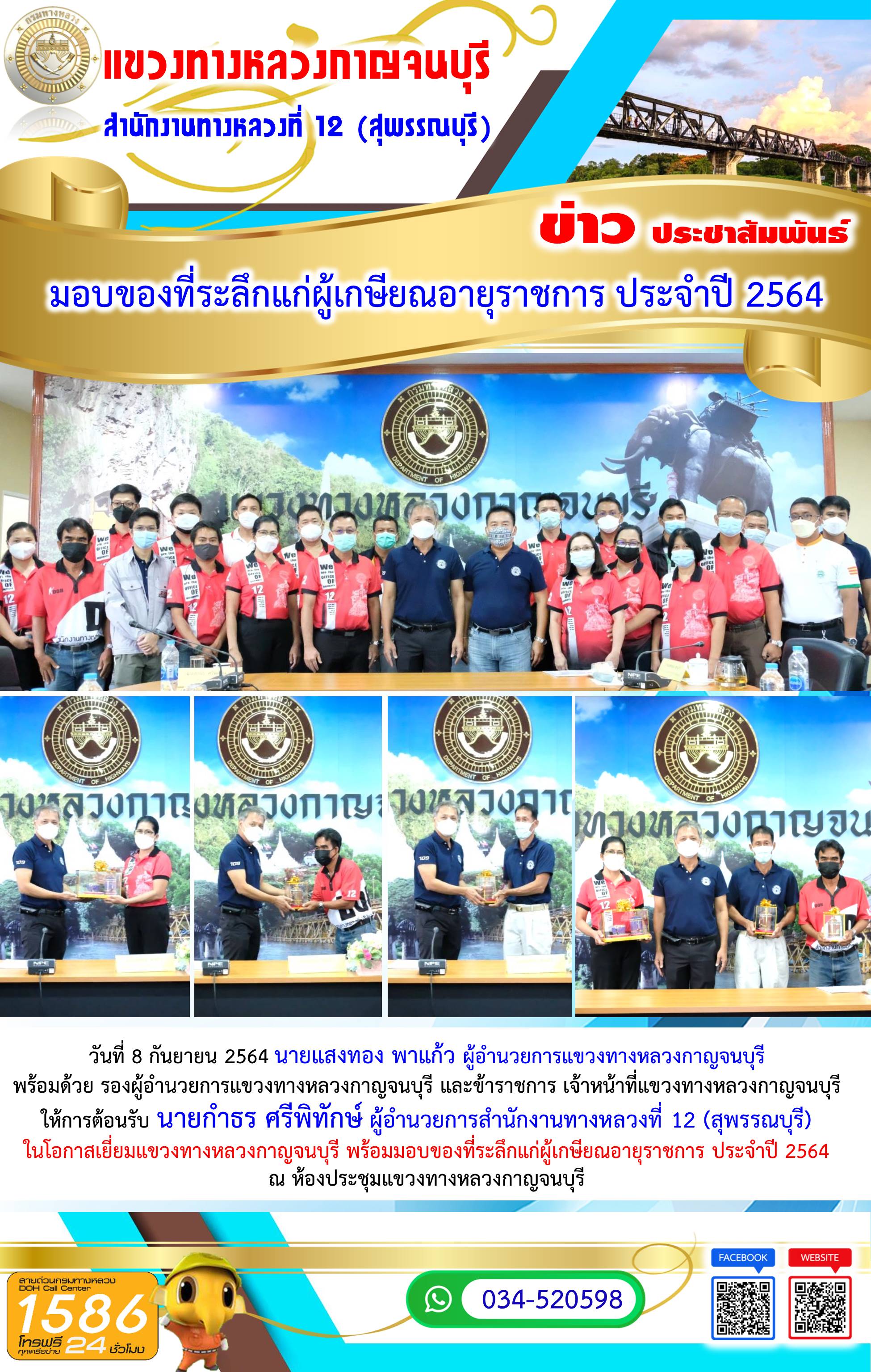 วันที่ 8 กันยายน 2564 นายแสงทอง พาแก้ว ผู้อำนวยการแขวงทางหลวงกาญจนบุรี พร้อมด้วย รองผู้อำนวยการแขวงทางหลวงกาญจนบุรี และข้าราชการ เจ้าหน้าที่แขวงทางหลวงกาญจนบุรี ให้การต้อนรับ นายกำธร ศรีพิทักษ์ ผู้อำนวยการสำนักงานทางหลวงที่ 12 (สุพรรณบุรี) ในโอกาสเยี่ยมแขวงทางหลวงกาญจนบุรี พร้อมมอบของที่ระลึกแก่ผู้เกษียณอายุราชการ ประจำปี 2564 ณ ห้องประชุมแขวงทางหลวงกาญจนบุรี