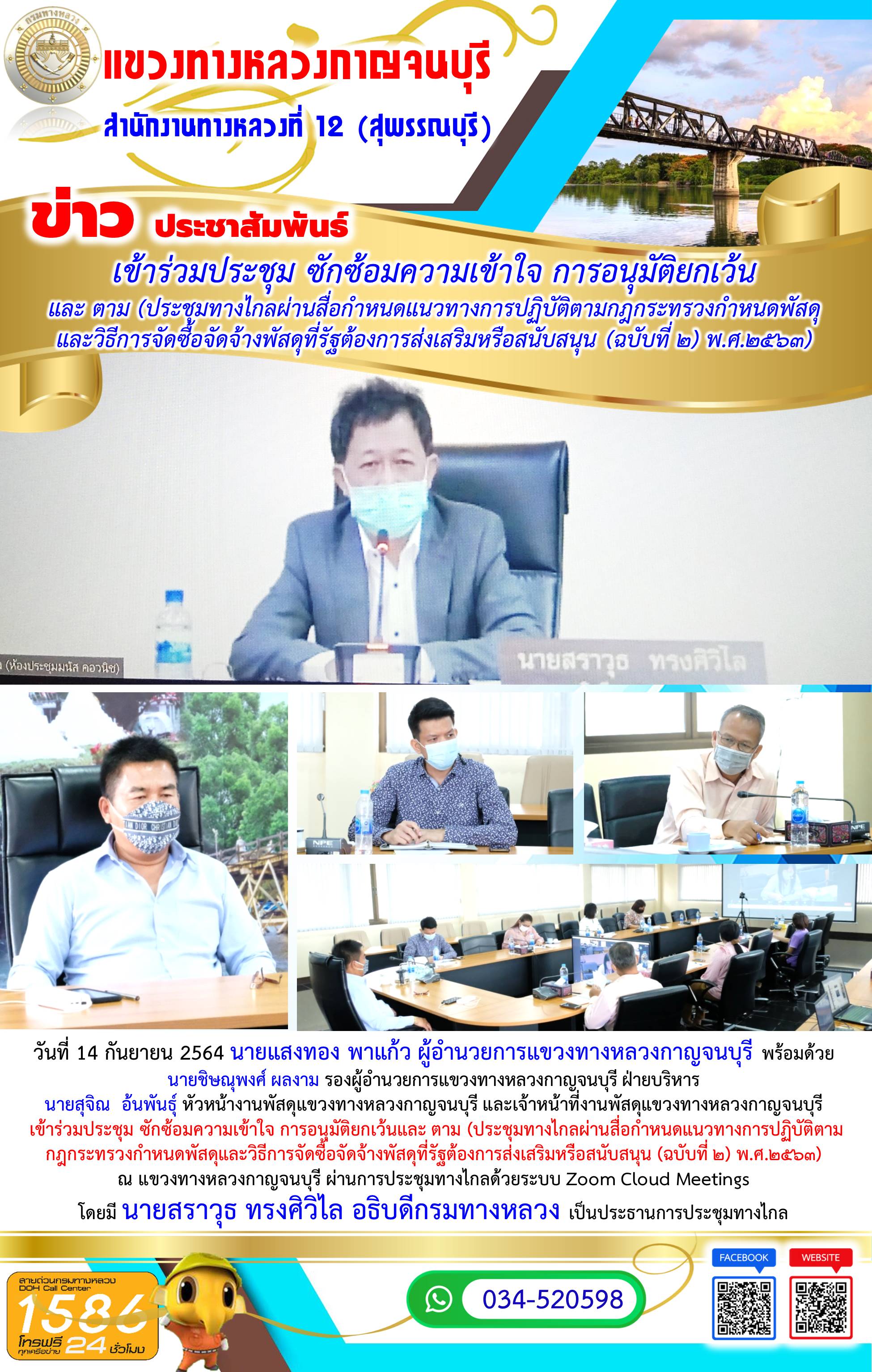 วันที่ 14 กันยายน 2564 นายแสงทอง พาแก้ว ผู้อำนวยการแขวงทางหลวงกาญจนบุรี พร้อมด้วย นายชิษณุพงศ์ ผลงาม รองผู้อำนวยการแขวงทางหลวงกาญจนบุรี ฝ่ายบริหาร นายสุจิณ อ้นพันธุ์ หัวหน้างานพัสดุแขวงทางหลวงกาญจนบุรี และเจ้าหน้าที่งานพัสดุแขวงทางหลวงกาญจนบุรี เข้าร่วมประชุม ซักซ้อมความเข้าใจ การอนุมัติยกเว้นและ ตาม (ประชุมทางไกลผ่านสื่อกำหนดแนวทาง การปฏิบัติตามกฎกระทรวงกำหนดพัสดุและวิธีการจัดซื้อจัดจ้างพัสดุที่รัฐต้องการส่งเสริมหรือสนับสนุน (ฉบับที่ ๒) พ.ศ.๒๕๖๓)
