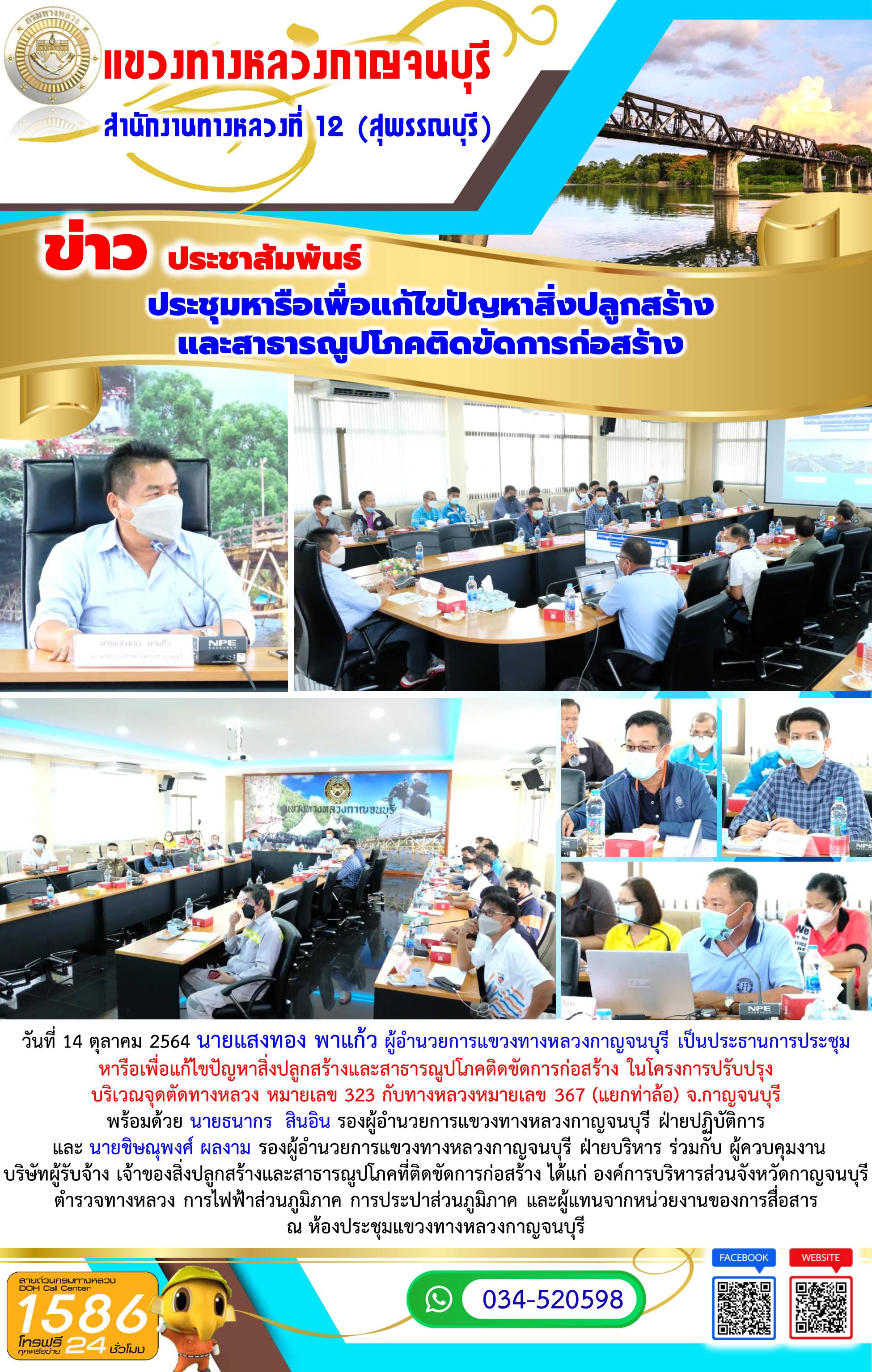 วันที่ 14 ตุลาคม 2564 นายแสงทอง พาแก้ว ผู้อำนวยการแขวงทางหลวงกาญจนบุรี เป็นประธานการประชุมหารือเพื่อแก้ไขปัญหาสิ่งปลูกสร้างและสาธารณูปโภคติดขัดการก่อสร้าง ในโครงการปรับปรุงบริเวณจุดตัดทางหลวง หมายเลข 323 กับทางหลวงหมายเลข 367 (แยกท่าล้อ) จ.กาญจนบุรี