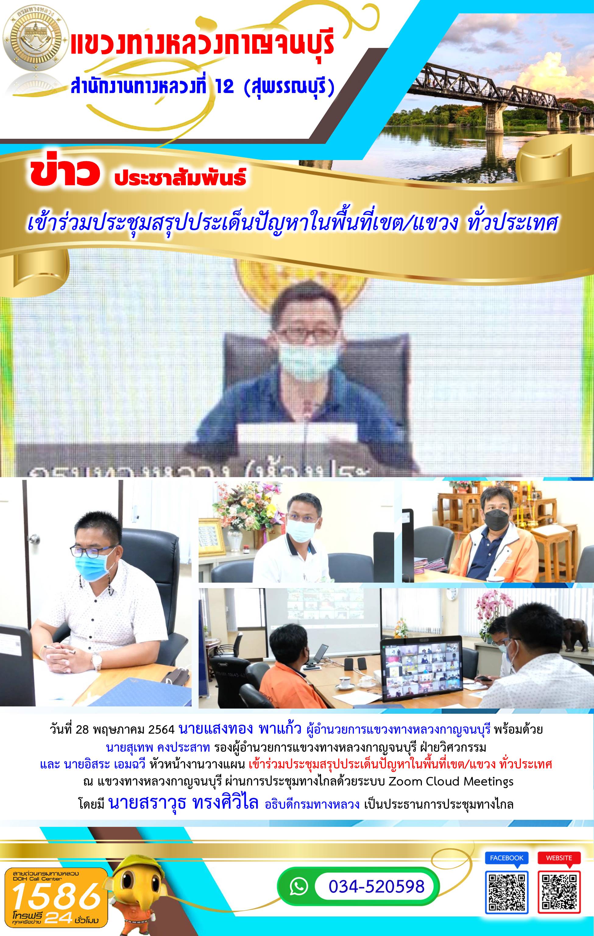 วันที่ 28 พฤษภาคม 2564 นายแสงทอง พาแก้ว ผู้อำนวยการแขวงทางหลวงกาญจนบุรี พร้อมด้วย นายสุเทพ คงประสาท รองผู้อำนวยการแขวงทางหลวงกาญจนบุรี ฝ่ายวิศวกรรม และ นายอิสระ เอมฉวี หัวหน้างานวางแผน เข้าร่วมประชุมสรุปประเด็นปัญหาในพื้นที่เขต/แขวง ทั่วประเทศ ณ แขวงทางหลวงกาญจนบุรี ผ่านการประชุมทางไกลด้วยระบบ Zoom Cloud Meetings โดยมี นายสราวุธ ทรงศิวิไล อธิบดีกรมทางหลวง เป็นประธานการประชุมทางไกล