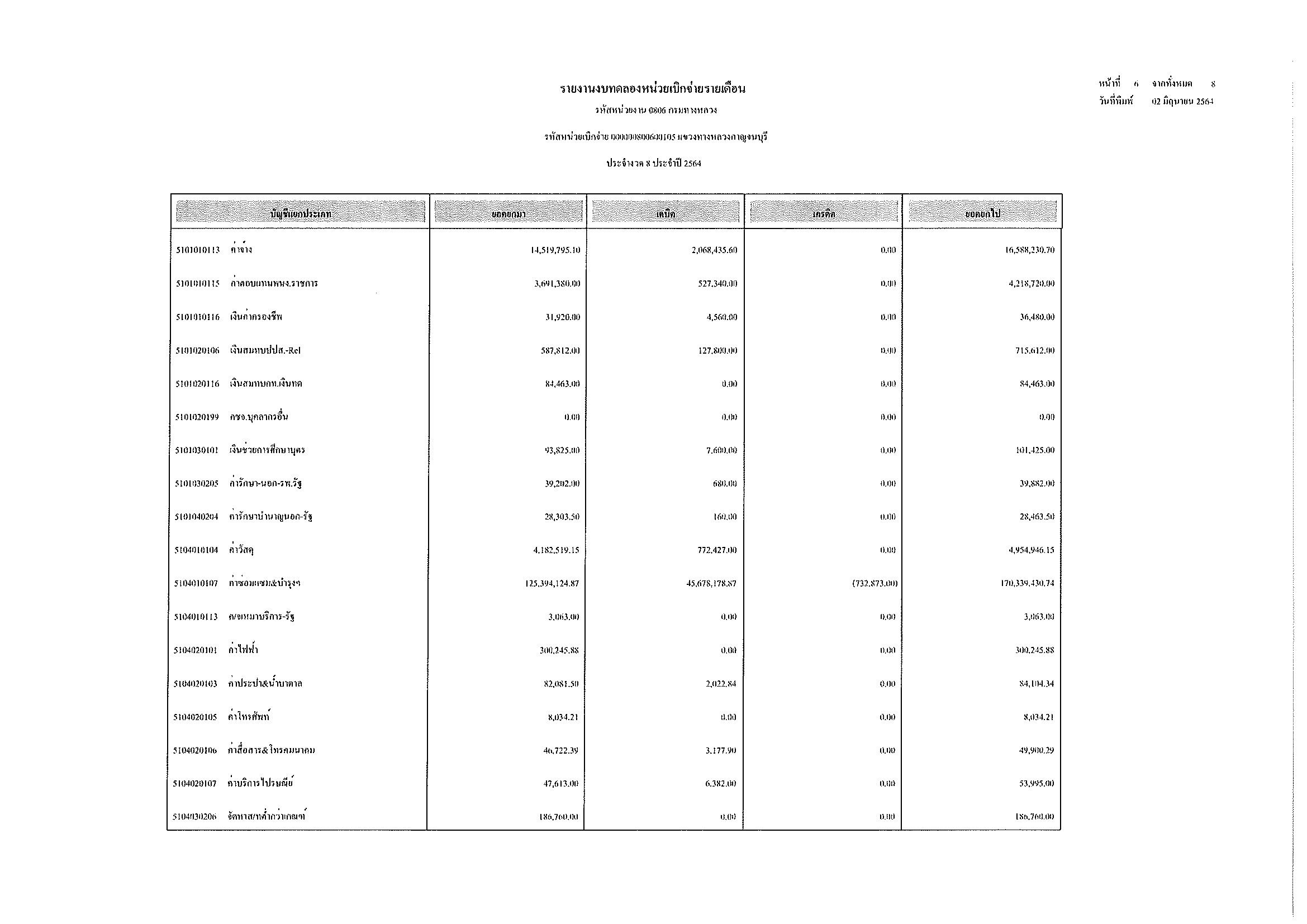 รายงานงบทดลองหน่วยเบิกจ่ายรายเดือน ประจำงวด 8 ประจำปีที่ 2564