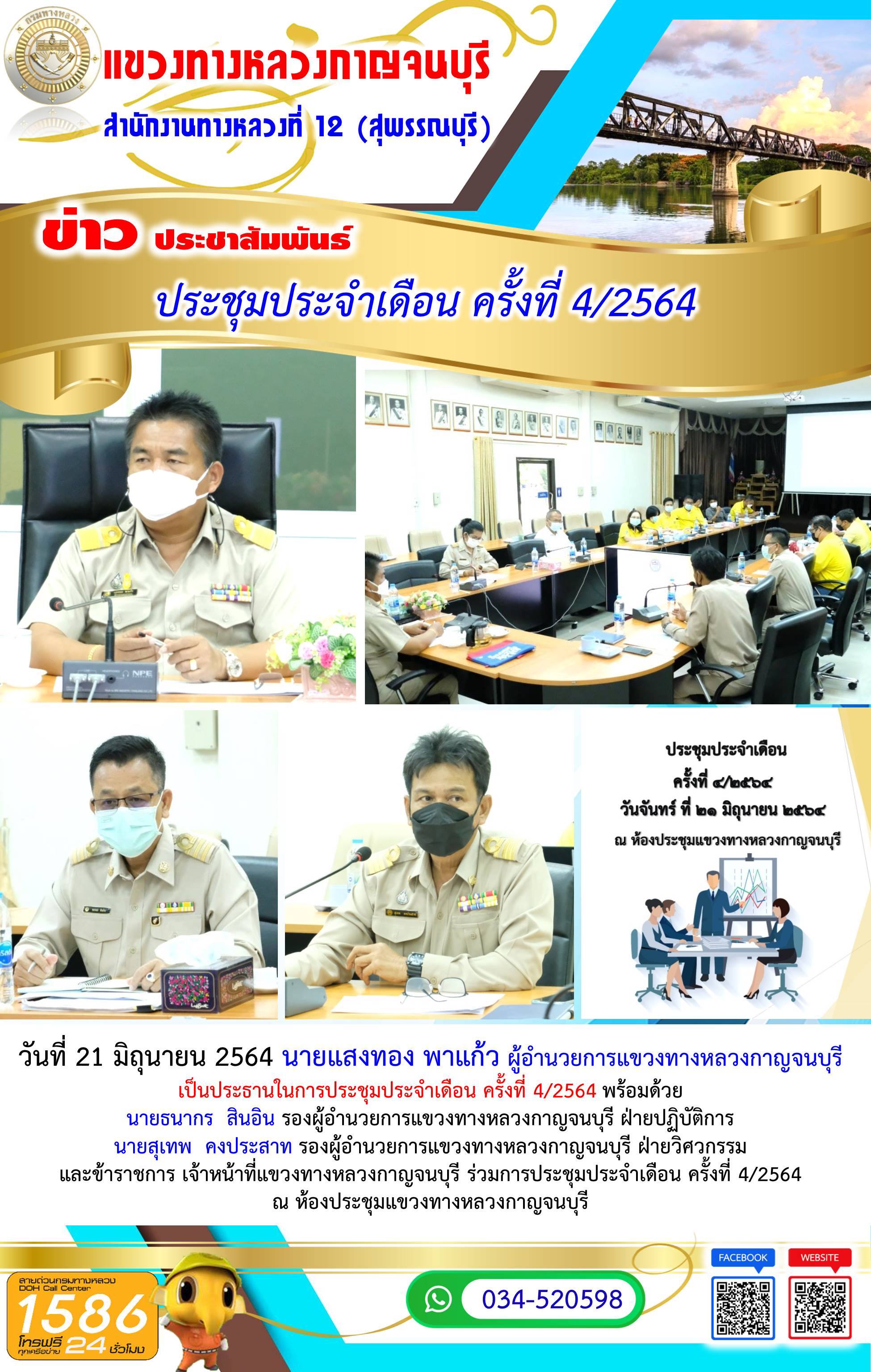 วันที่ 23 มิถุนายน 2564 นายแสงทอง พาแก้ว ผู้อำนวยการแขวงทางหลวงกาญจนบุรี พร้อมด้วย นายสุเทพ คงประสาท รองผู้อำนวยการแขวงทางหลวงกาญจนบุรี ฝ่ายวิศวกรรม เข้าร่วมประชุมตรวจรับงานจ้างเหมา ทำการยกระดับมาตรฐานและเพิ่มประสิทธิภาพทางหลวง ทางหลวงหมายเลข 3398 ตอน ท่าพะเนียด - ทุ่งมะสังข์ ระหว่าง กม.7+200 – กม.11+600 ณ ห้องประชุมแขวงทางหลวงกาญจนบุรี โดยมี นายนพพร พิสุทธิมาน รองผู้อำนวยการสำนักงานทางหลวงที่ 12 (สุพรรณบุรี) เป็นประธานในการประชุมฯ