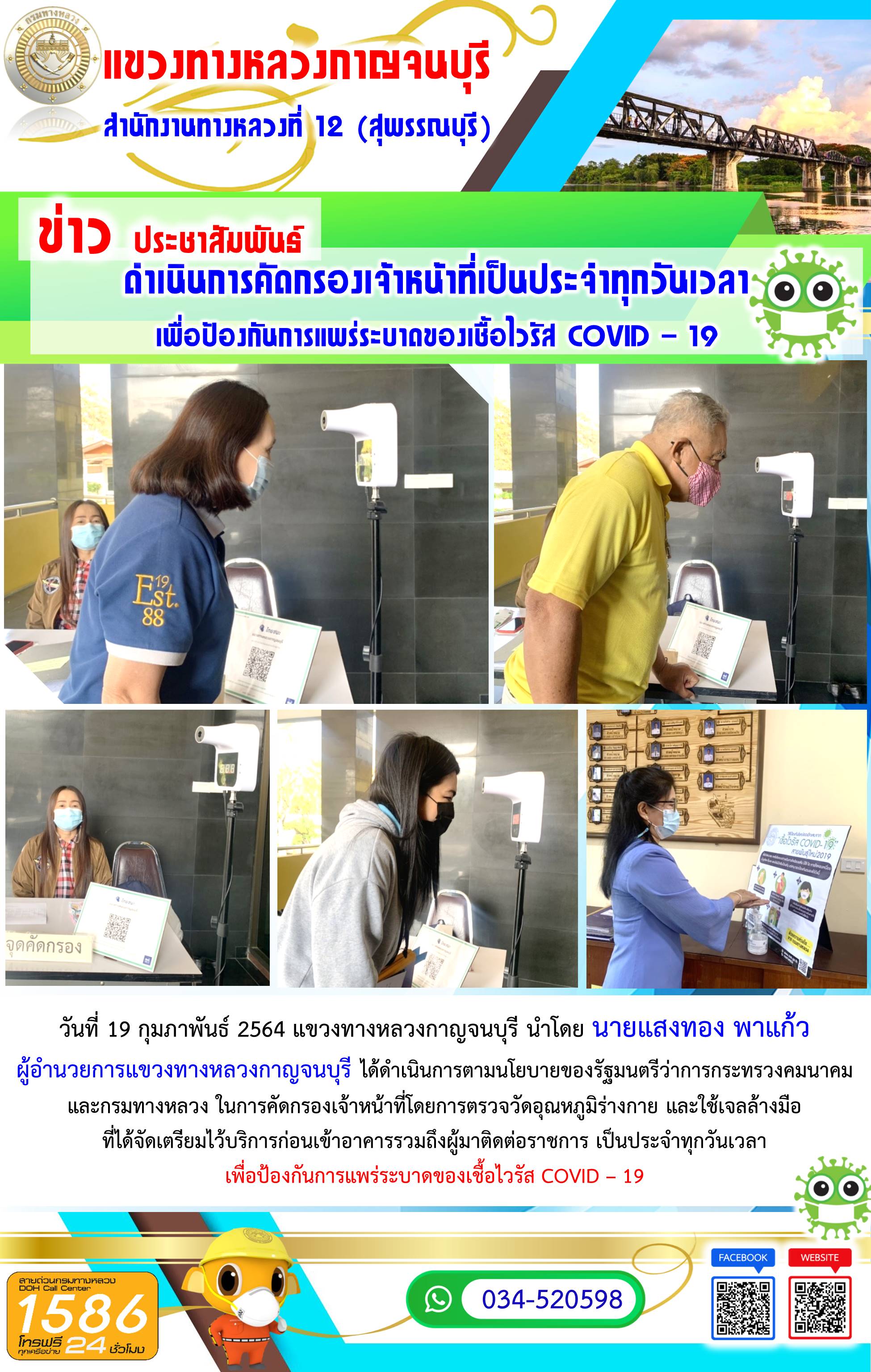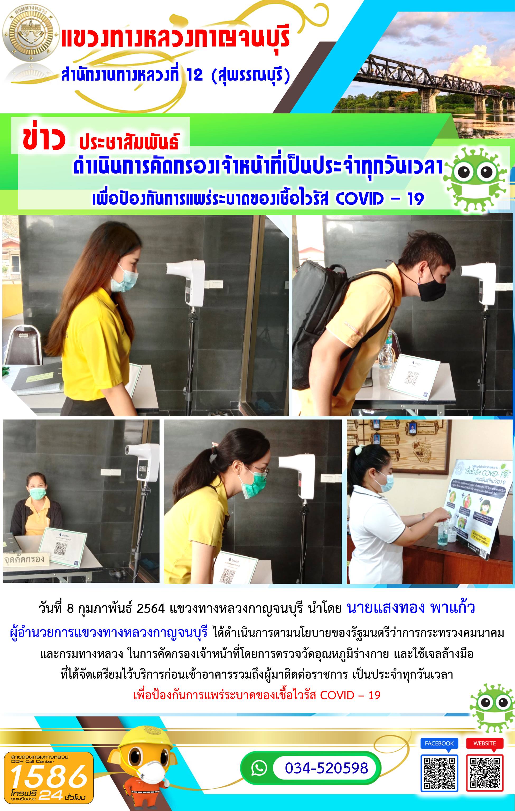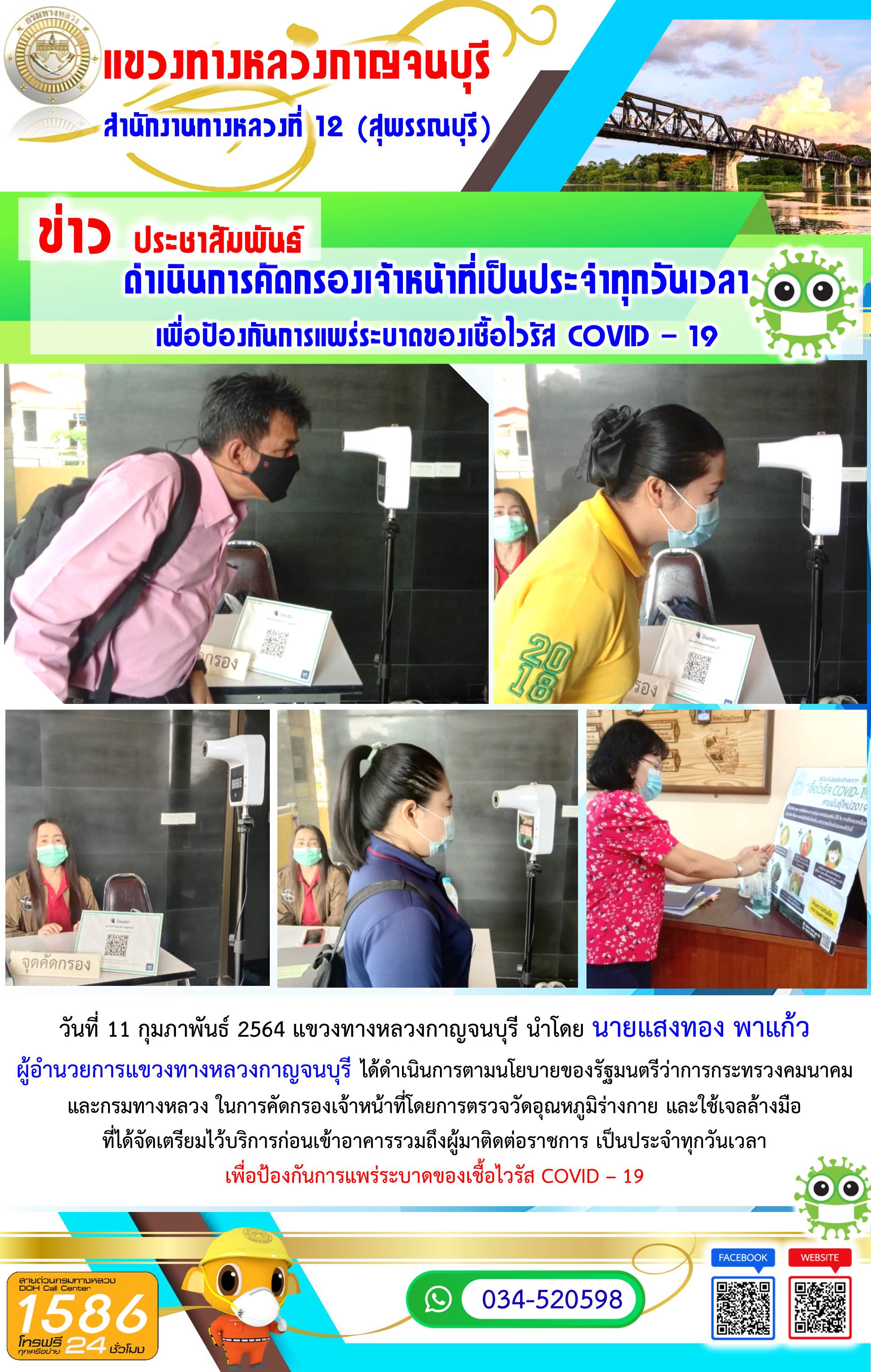 401 15/02/2564 วันที่ 15 กุมภาพันธ์ 2564 แขวงทางหลวงกาญจนบุรี นำโดย นายแสงทอง พาแก้ว ผู้อำนวยการแขวงทางหลวงกาญจนบุรี ได้ดำเนินการตามนโยบายของรัฐมนตรีว่าการกระทรวงคมนาคมและกรมทางหลวง ในการคัดกรองเจ้าหน้าที่โดยการตรวจวัดอุณหภูมิร่างกาย และใช้เจลล้างมือที่ได้จัดเตรียมไว้บริการก่อนเข้าอาคารรวมถึงผู้มาติดต่อราชการ เพื่อป้องกันการแพร่ระบาดของเชื้อไวรัส COVID – 19