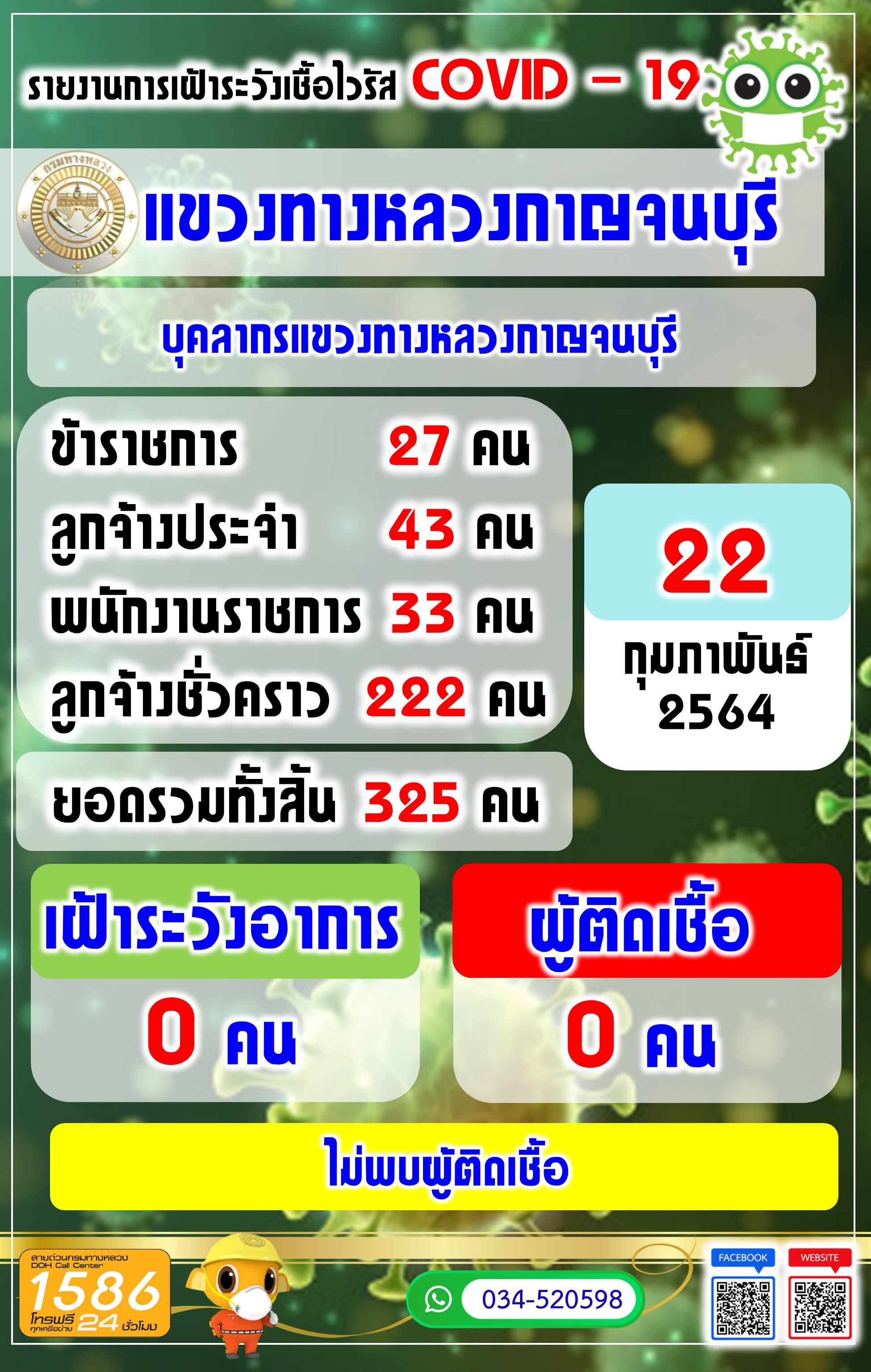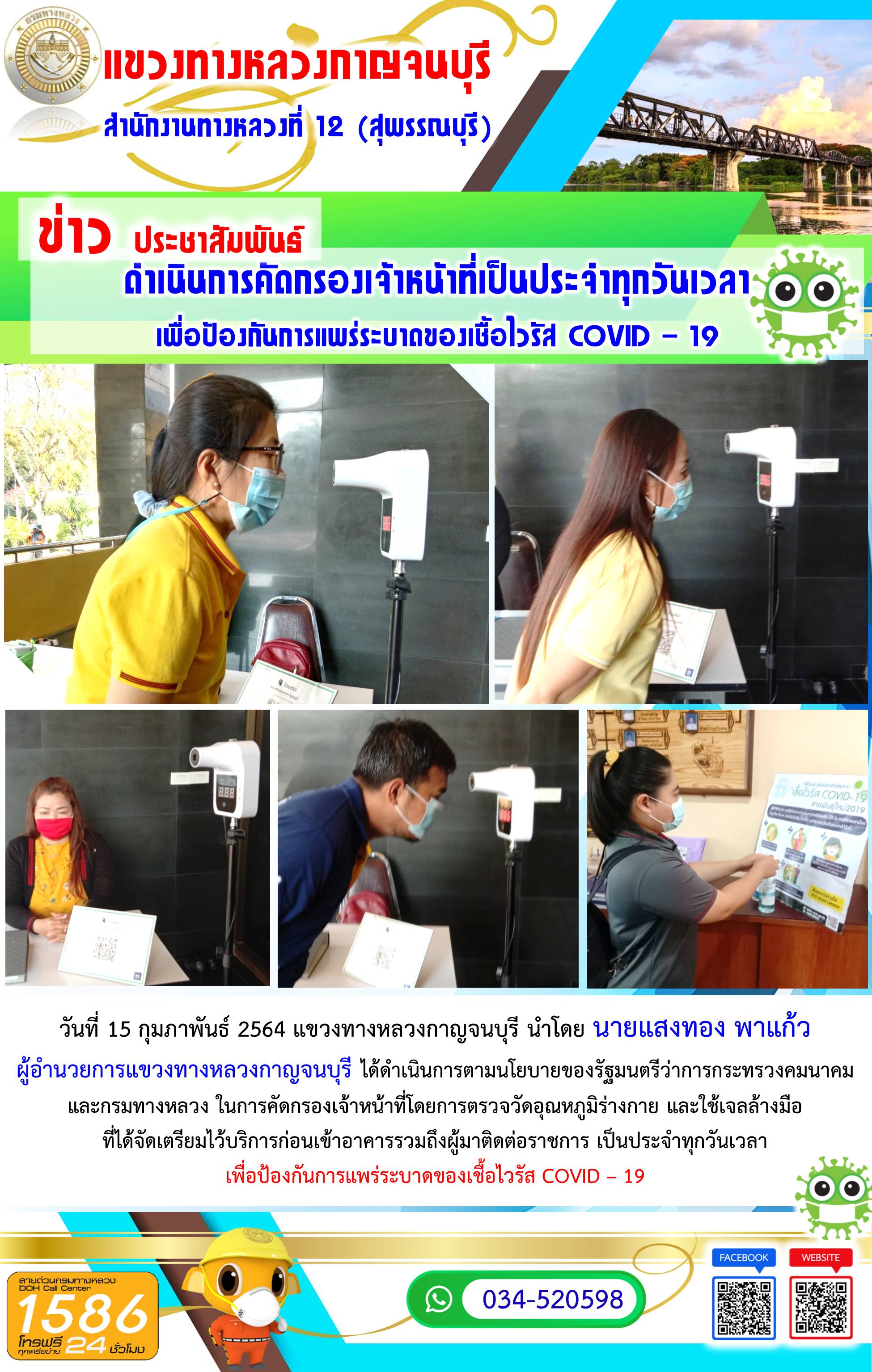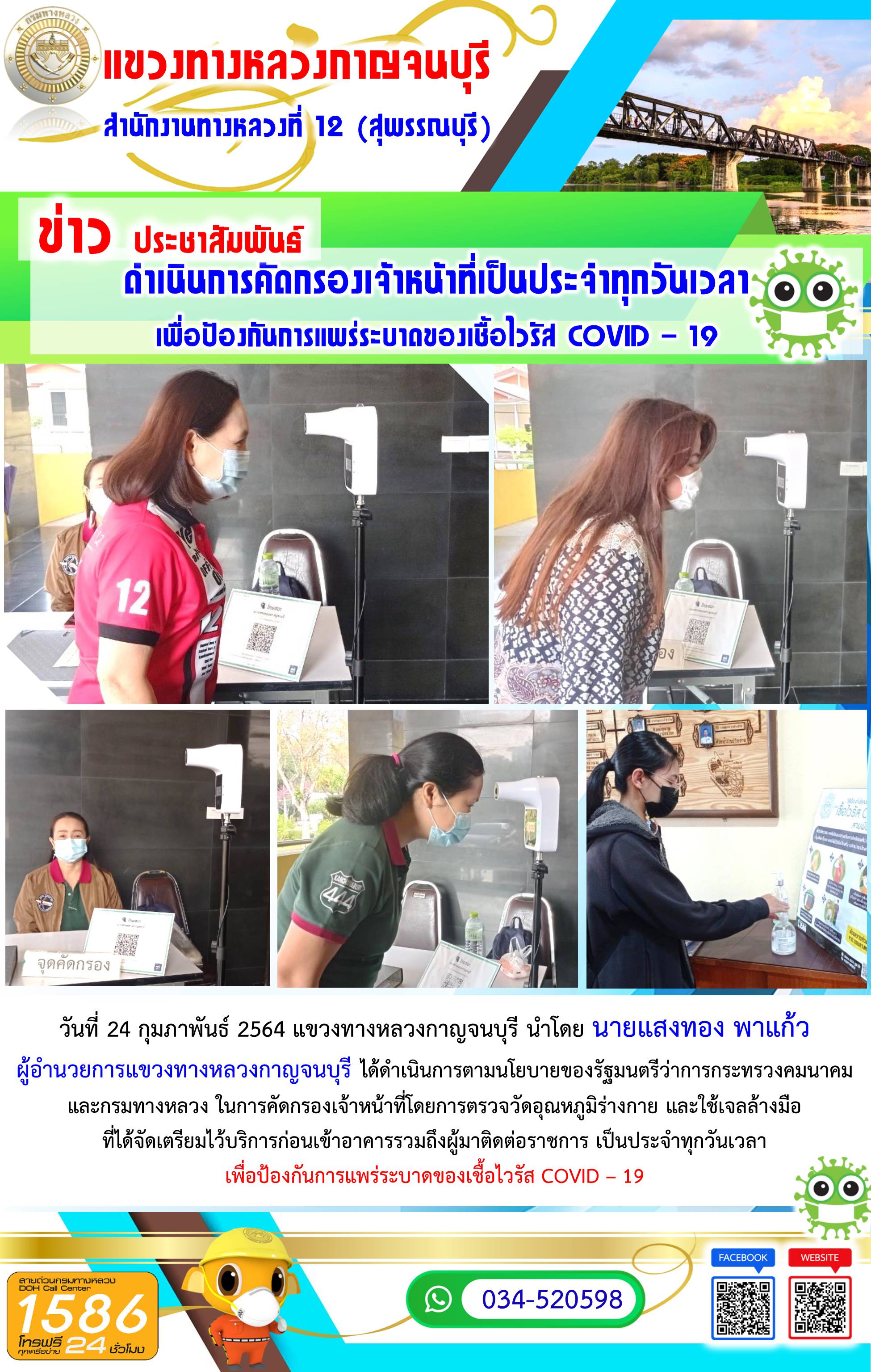 401 15/02/2564 วันที่ 15 กุมภาพันธ์ 2564 แขวงทางหลวงกาญจนบุรี นำโดย นายแสงทอง พาแก้ว ผู้อำนวยการแขวงทางหลวงกาญจนบุรี ได้ดำเนินการตามนโยบายของรัฐมนตรีว่าการกระทรวงคมนาคมและกรมทางหลวง ในการคัดกรองเจ้าหน้าที่โดยการตรวจวัดอุณหภูมิร่างกาย และใช้เจลล้างมือที่ได้จัดเตรียมไว้บริการก่อนเข้าอาคารรวมถึงผู้มาติดต่อราชการ เพื่อป้องกันการแพร่ระบาดของเชื้อไวรัส COVID – 19