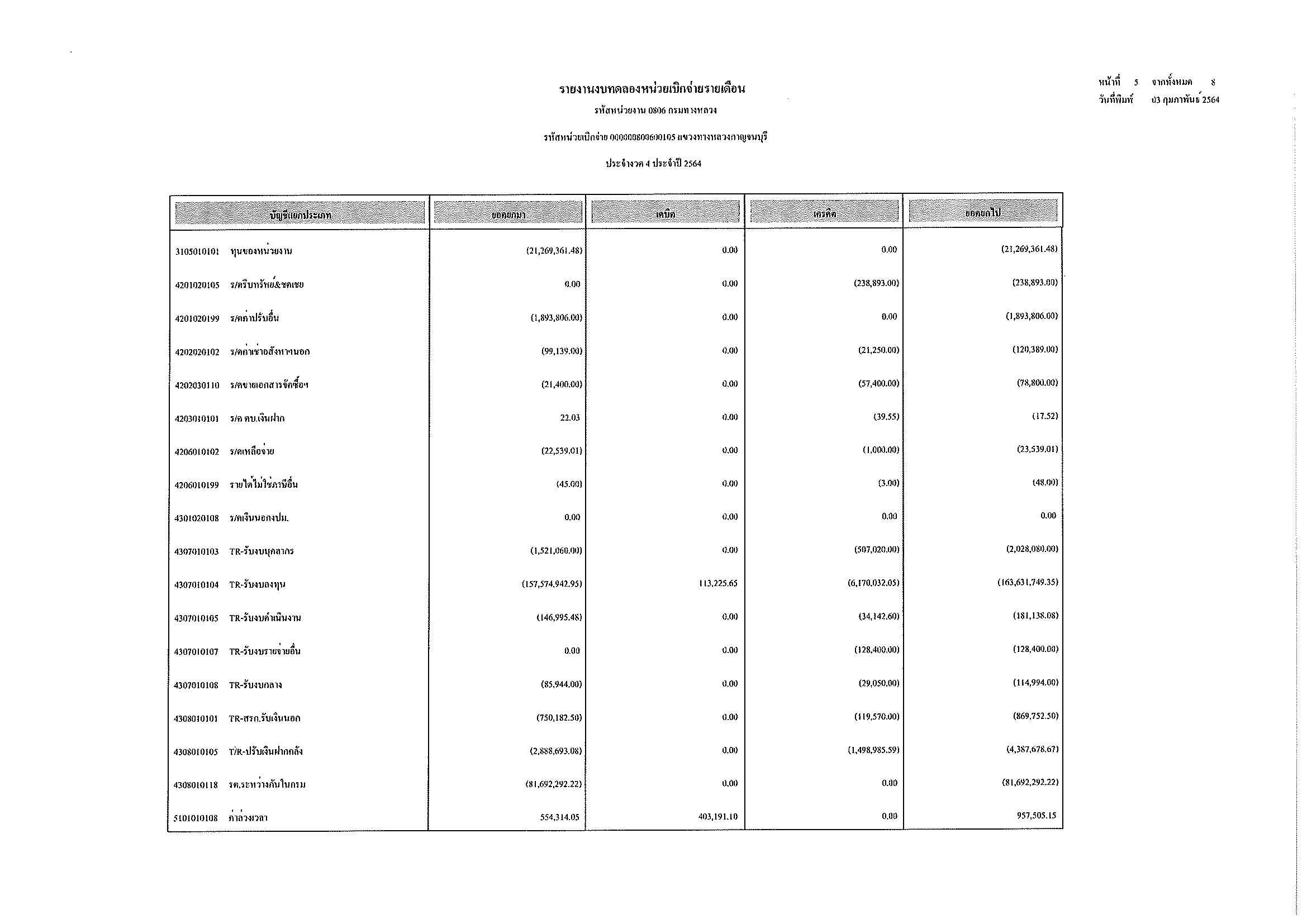404 09/02/2564 รายงานงบทดลองหน่วยเบิกจ่ายรายเดือน ประจำงวด 4 ประจำปีที่ 2564