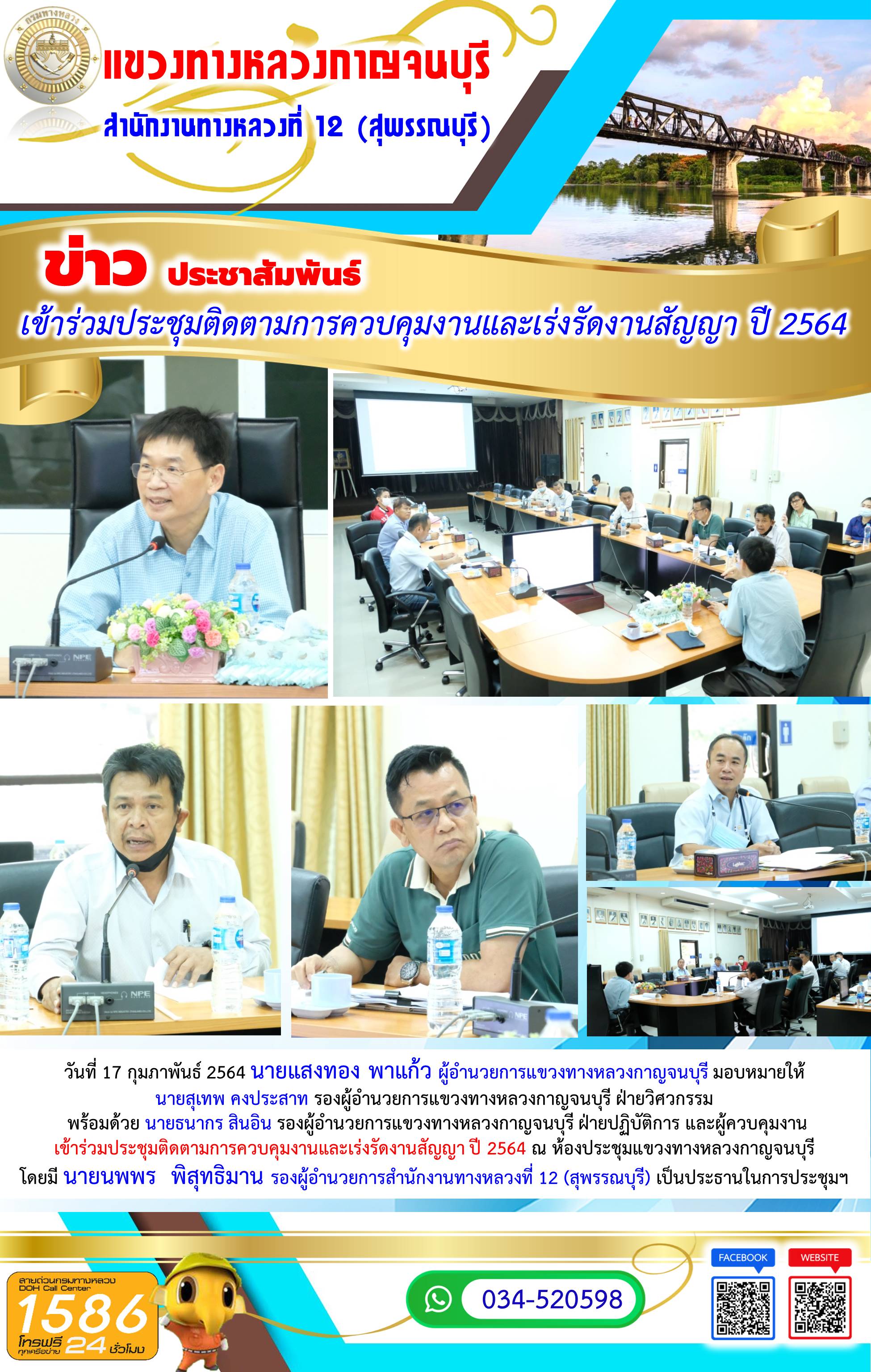 400 18/02/2564 วันที่ 17 กุมภาพันธ์ 2564 นายแสงทอง พาแก้ว ผู้อำนวยการแขวงทางหลวงกาญจนบุรี มอบหมายให้ นายสุเทพ คงประสาท รองผู้อำนวยการแขวงทางหลวงกาญจนบุรี ฝ่ายวิศวกรรม พร้อมด้วย นายธนากร สินอิน รองผู้อำนวยการแขวงทางหลวงกาญจนบุรี ฝ่ายปฏิบัติการ และผู้ควบคุมงาน เข้าร่วมประชุมติดตามการควบคุมงานและเร่งรัดงานสัญญา ปี 2564 ณ ห้องประชุมแขวงทางหลวงกาญจนบุรี โดยมี นายนพพร พิสุทธิมาน รองผู้อำนวยการสำนักงานทางหลวงที่ 12 (สุพรรณบุรี) เป็นประธานในการประชุมฯ