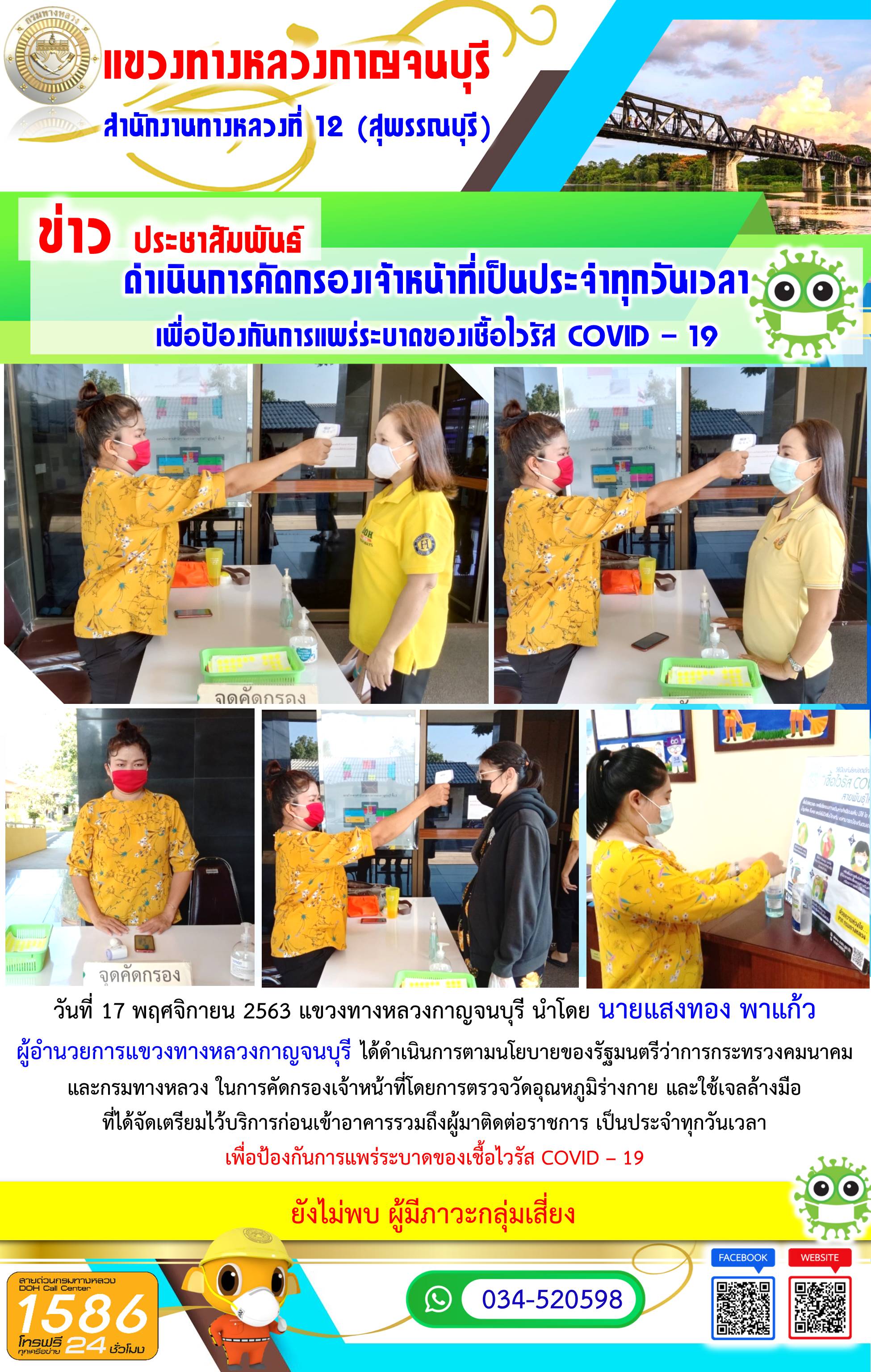วันที่ 23 พฤศจิกายน 2563 แขวงทางหลวงกาญจนบุรี นำโดย นายแสงทอง พาแก้ว ผู้อำนวยการแขวงทางหลวงกาญจนบุรี ได้ดำเนินการตามนโยบายของรัฐมนตรีว่าการกระทรวงคมนาคมและกรมทางหลวง ในการคัดกรองเจ้าหน้าที่โดยการตรวจวัดอุณหภูมิร่างกาย และใช้เจลล้างมือที่ได้จัดเตรียมไว้บริการก่อนเข้าอาคารรวมถึงผู้มาติดต่อราชการ เพื่อป้องกันการแพร่ระบาดของเชื้อไวรัส COVID – 19