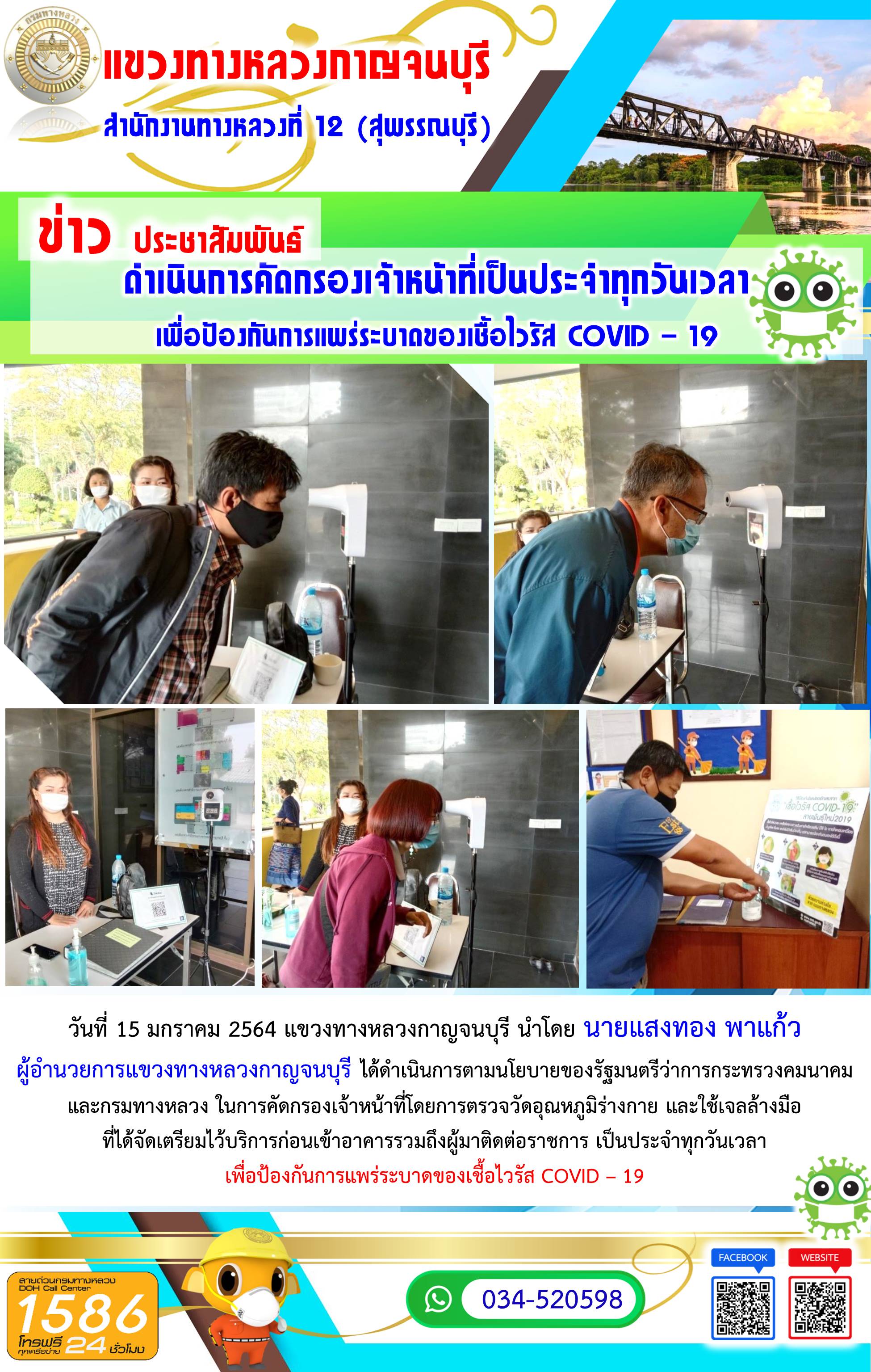 วันที่ 15 มกราคม 2564 แขวงทางหลวงกาญจนบุรี นำโดย นายแสงทอง พาแก้ว ผู้อำนวยการแขวงทางหลวงกาญจนบุรี ได้ดำเนินการตามนโยบายของรัฐมนตรีว่าการกระทรวงคมนาคมและกรมทางหลวง ในการคัดกรองเจ้าหน้าที่โดยการตรวจวัดอุณหภูมิร่างกาย และใช้เจลล้างมือที่ได้จัดเตรียมไว้บริการก่อนเข้าอาคารรวมถึงผู้มาติดต่อราชการ เพื่อป้องกันการแพร่ระบาดของเชื้อไวรัส COVID – 19