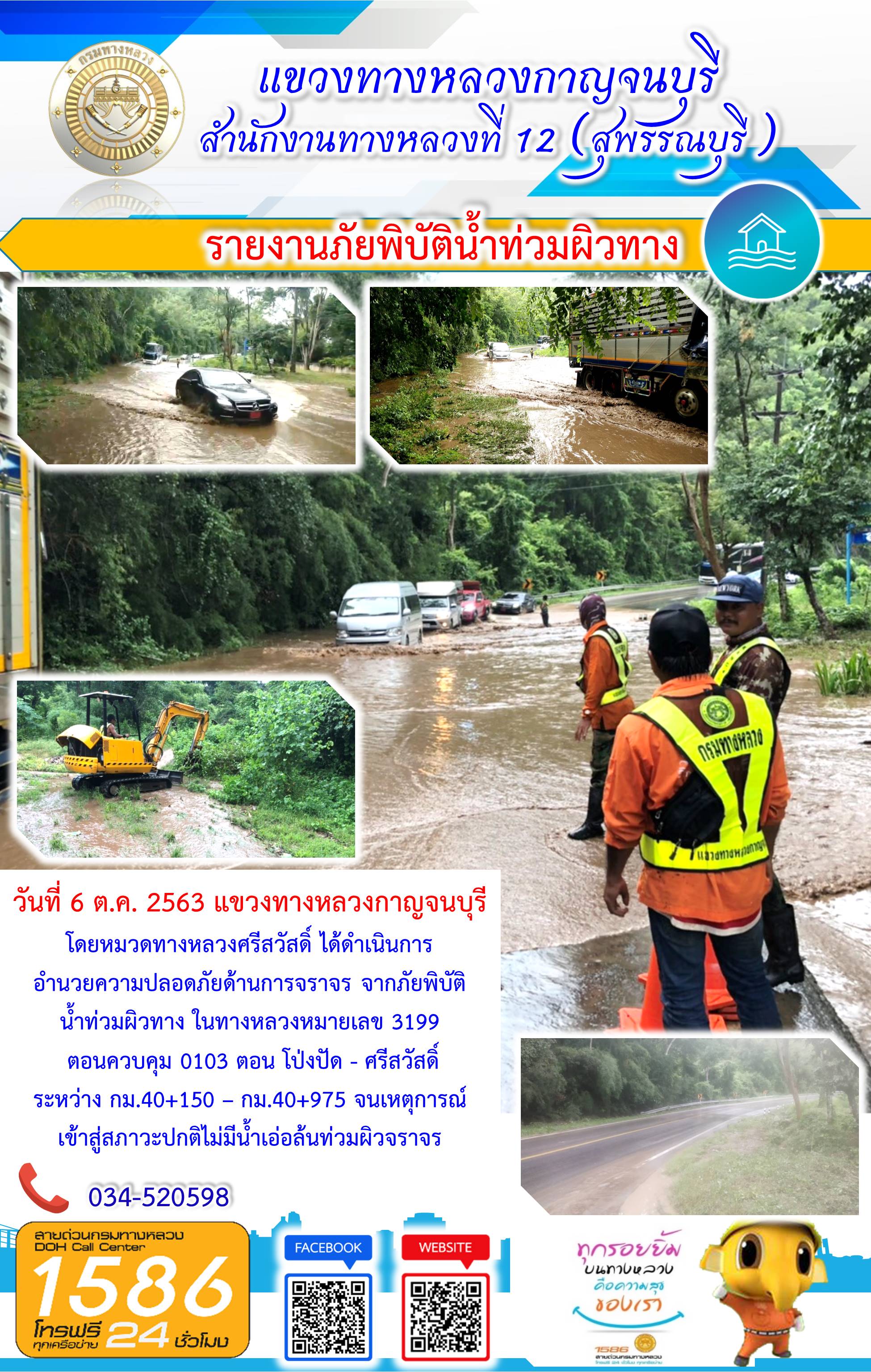 แขวงทางหลวงกาญจนบุรีโดยหมวดทางหลวงในสังกัด ได้ดำเนินการอำนวยความปลอดภัยด้านการจราจร จากภัยพิบัติน้ำท่วมผิวทาง