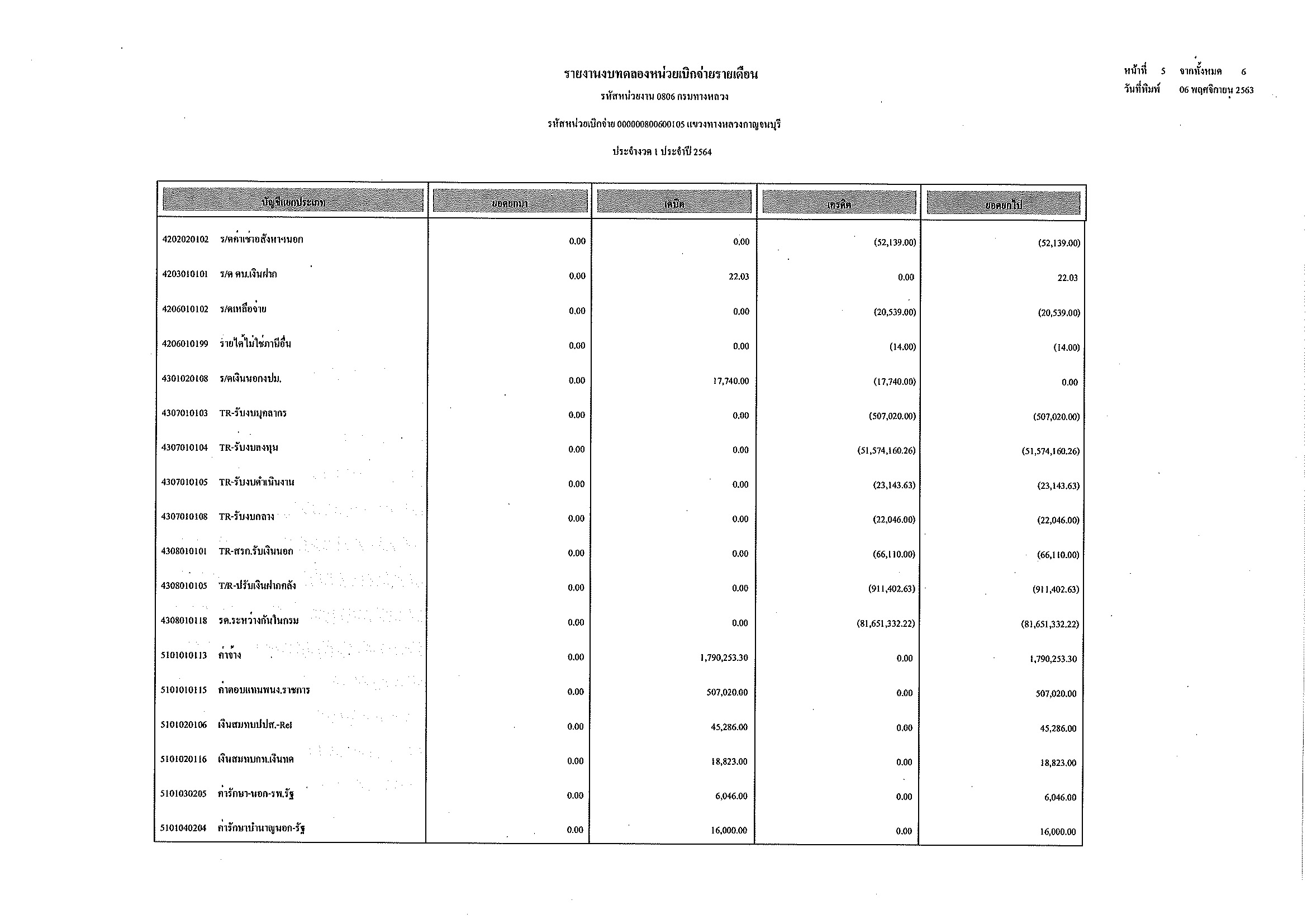 รายงานงบทดลองหน่วยเบิกจ่ายรายเดือน ประจำงวด 1 ประจำปีที่ 2564