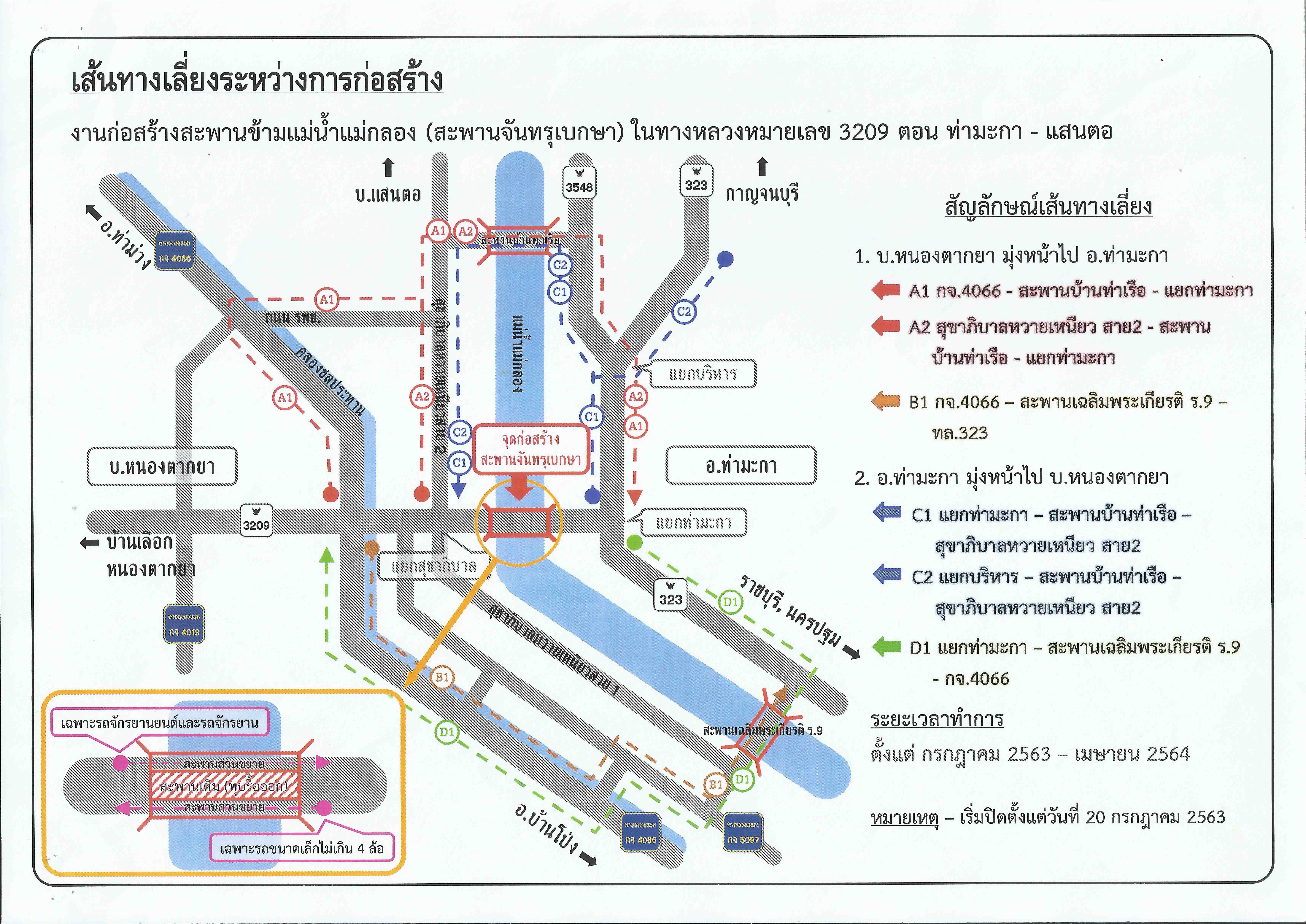 450 17/07/2563 ประชาสัมพันธ์เส้นทางเลี่ยงระหว่างการก่อสร้าง งานก่อสร้างสะพานข้ามแม่น้ำแม่กลอง (สะพานจันทรุเบกษา) ในทางหลวงหมายเลข 3209 ตอน ท่ามะกา - แสนตอ