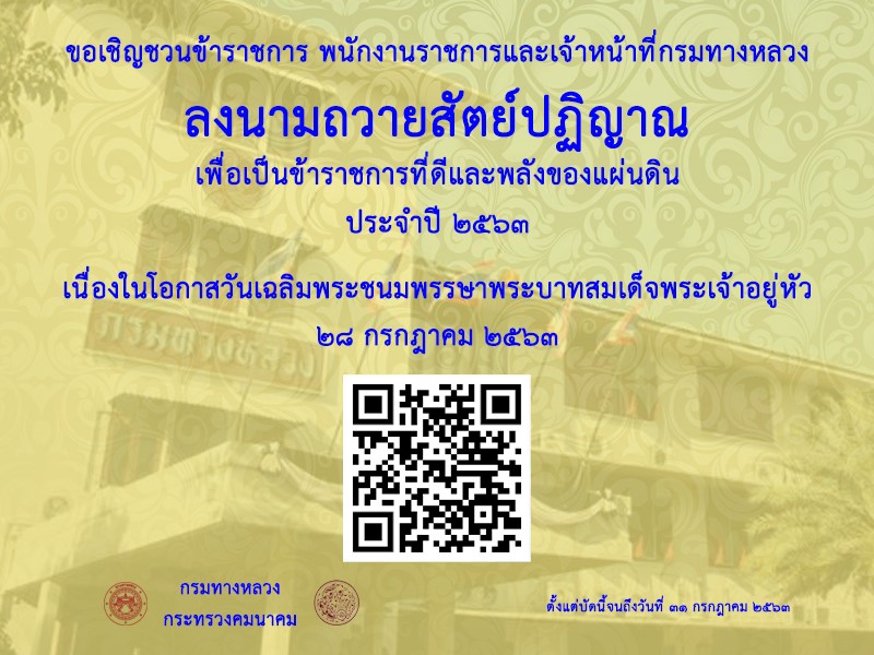 449 24/07/2563 ขอเชิญชวนข้าราชการ พนักงานราชการ และเจ้าหน้าที่กรมทางหลวง ลงนามถวายสัตย์ปฏิญาณ ทางออนไลน์ (สแกน QR-Code) เพื่อเป็นข้าราชการที่ดีและพลังของแผ่นดิน ประจำปี ๒๕๖๓ เนื่องในโอกาสวันเฉลิมพระชนมพรรษาพระบาทสมเด็จพระเจ้าอยู่หัว ๒๘ กรกฎาคม ๒๕๖๓ ตั้งแต่บัดนี้จนถึงวันที่ ๓๑ กรกฎาคม ๒๕๖๓