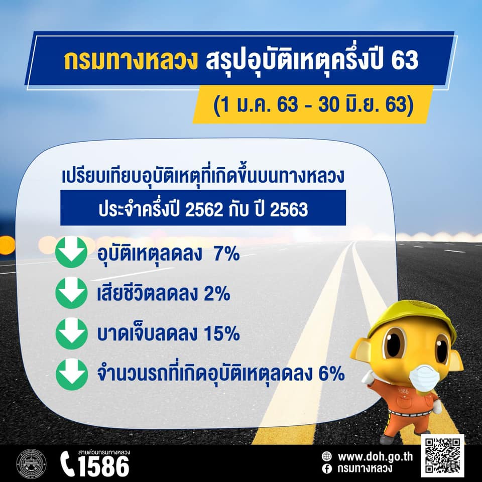 448 31/07/2563 กรมทางหลวง สรุปอุบัติเหตุบนทางหลวงครึ่งปี 2563 อุบัติเหตุลดลง 7% ทางตรงเกิดเหตุสูงสุด พร้อมขอความร่วมมือผู้ใช้ทางปฏิบัติตามกฎจราจรอย่างเคร่งครัด