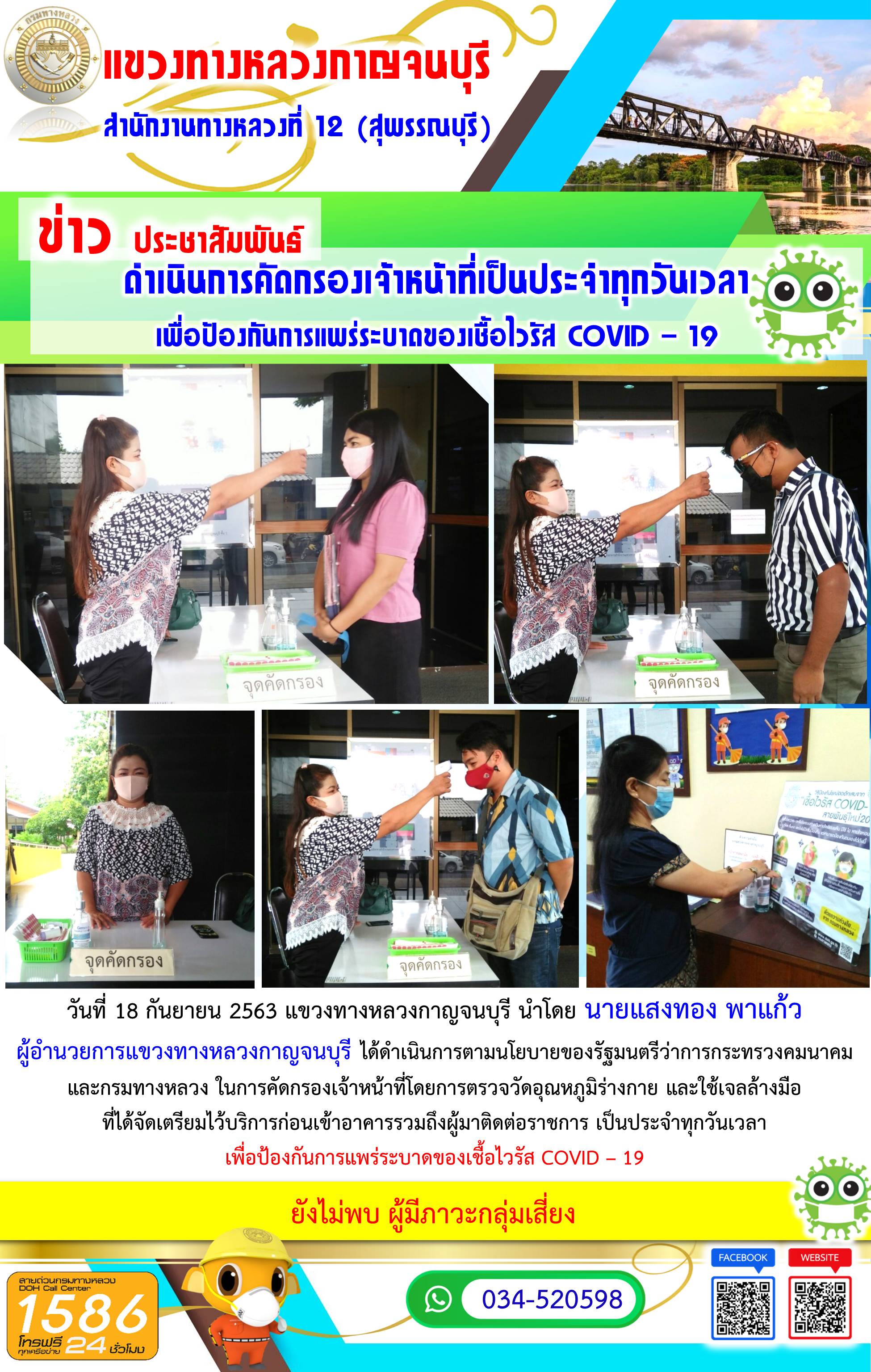 439 18/09/2563 วันที่ 18 กันยายน 2563 แขวงทางหลวงกาญจนบุรี นำโดย นายแสงทอง พาแก้ว ผู้อำนวยการแขวงทางหลวงกาญจนบุรี ได้ดำเนินการตามนโยบายของรัฐมนตรีว่าการกระทรวงคมนาคมและกรมทางหลวง ในการคัดกรองเจ้าหน้าที่โดยการตรวจวัดอุณหภูมิร่างกาย และใช้เจลล้างมือที่ได้จัดเตรียมไว้บริการก่อนเข้าอาคารรวมถึงผู้มาติดต่อราชการ เพื่อป้องกันการแพร่ระบาดของเชื้อไวรัส COVID – 19