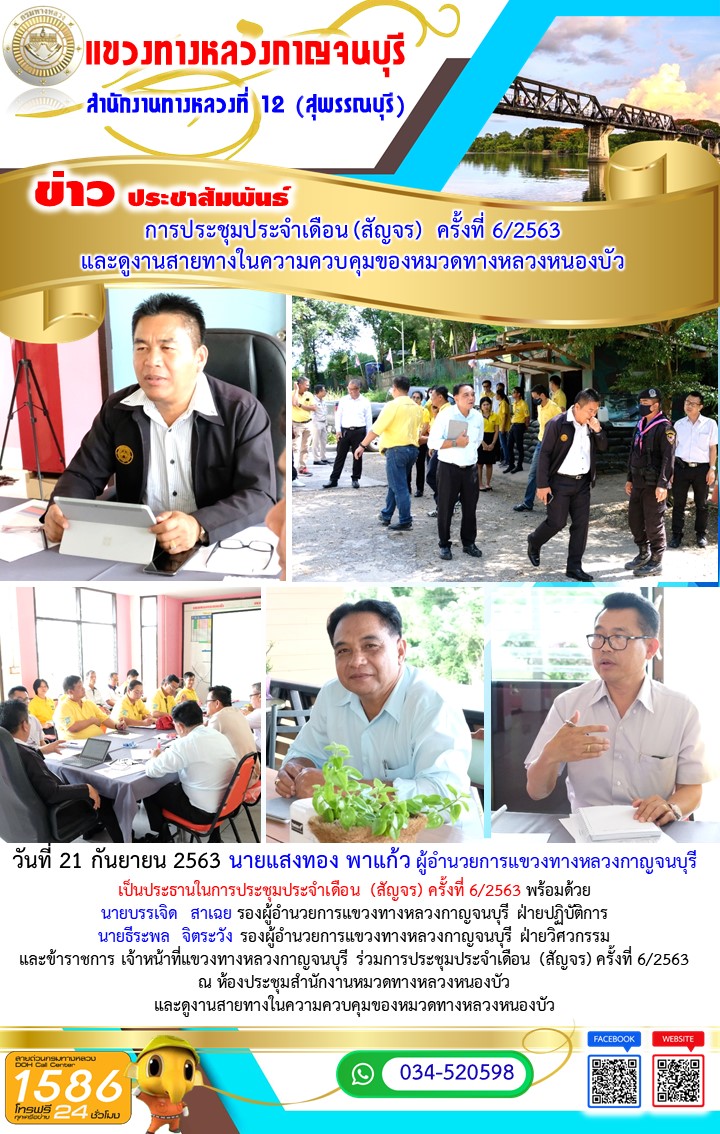 438 21/09/2563 วันที่ 21 กันยายน 2563 นายแสงทอง พาแก้ว ผู้อำนวยการแขวงทางหลวงกาญจนบุรี เป็นประธานในการประชุมประจำเดือน (สัญจร) ครั้งที่ 6/2563 พร้อมด้วย นายบรรเจิด สาเฉย รองผู้อำนวยการแขวงทางหลวงกาญจนบุรี ฝ่ายปฏิบัติการ นายธีระพล จิตระวัง รองผู้อำนวยการแขวงทางหลวงกาญจนบุรี ฝ่ายวิศวกรรม และข้าราชการ เจ้าหน้าที่แขวงทางหลวงกาญจนบุรี ร่วมการประชุมประจำเดือน (สัญจร) ครั้งที่ 6/2563 ณ ห้องประชุมสำนักงานหมวดทางหลวงหนองบัว และดูงานสายทางในความควบคุมของหมวดทางหลวงหนองบัว