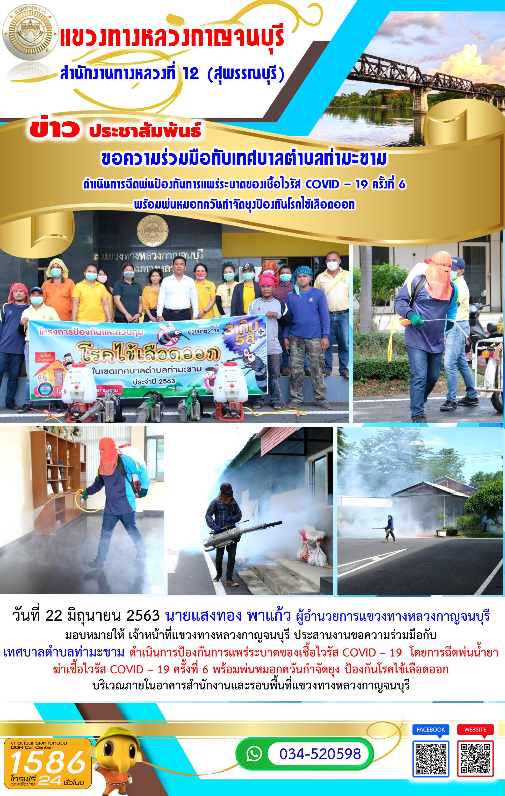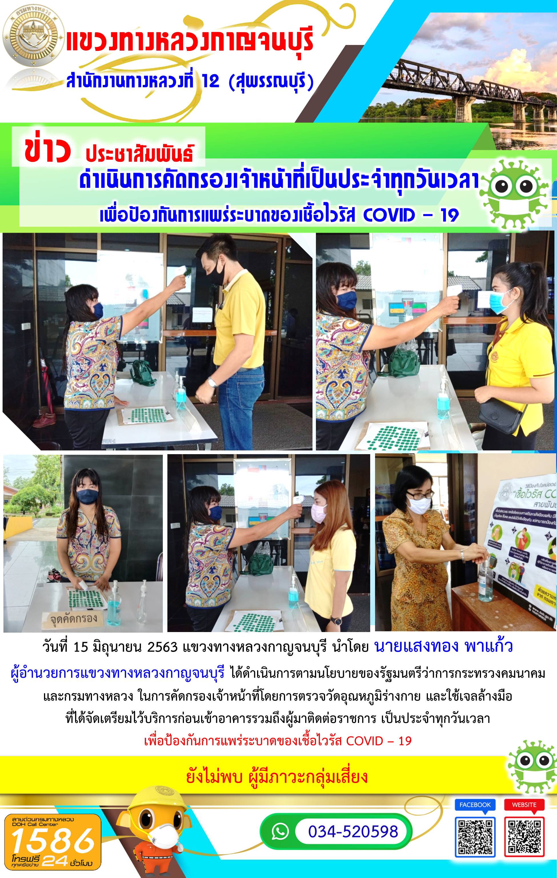465 16/06/2563 วันที่ 15 มิถุนายน 2563 แขวงทางหลวงกาญจนบุรี นำโดย นายแสงทอง พาแก้ว ผู้อำนวยการแขวงทางหลวงกาญจนบุรี ได้ดำเนินการตามนโยบายของรัฐมนตรีว่าการกระทรวงคมนาคมและกรมทางหลวง ในการคัดกรองเจ้าหน้าที่โดยการตรวจวัดอุณหภูมิร่างกาย และใช้เจลล้างมือที่ได้จัดเตรียมไว้บริการก่อนเข้าอาคารรวมถึงผู้มาติดต่อราชการ เพื่อป้องกันการแพร่ระบาดของเชื้อไวรัส COVID – 19