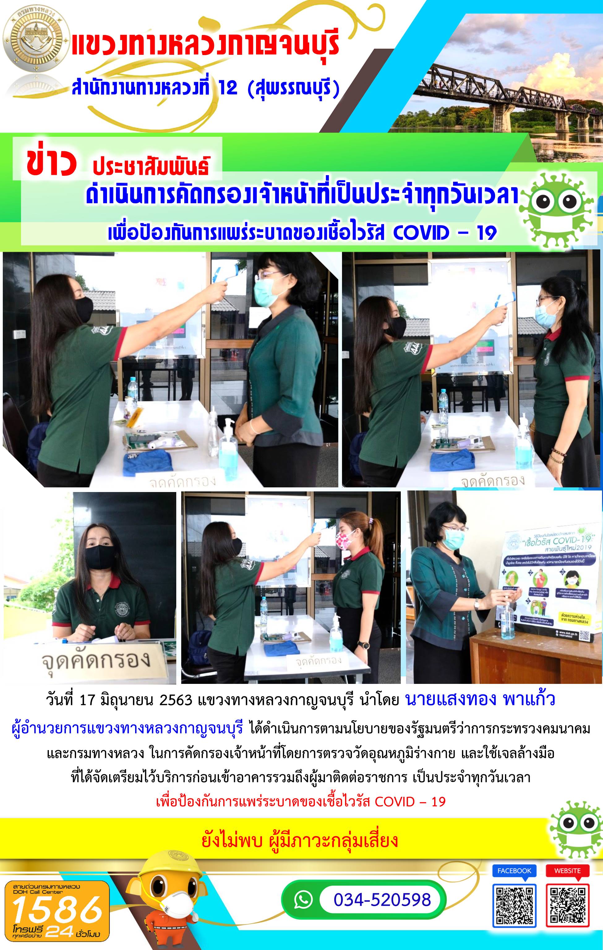 464 17/06/2563 วันที่ 17 มิถุนายน 2563 แขวงทางหลวงกาญจนบุรี นำโดย นายแสงทอง พาแก้ว ผู้อำนวยการแขวงทางหลวงกาญจนบุรี ได้ดำเนินการตามนโยบายของรัฐมนตรีว่าการกระทรวงคมนาคมและกรมทางหลวง ในการคัดกรองเจ้าหน้าที่โดยการตรวจวัดอุณหภูมิร่างกาย และใช้เจลล้างมือที่ได้จัดเตรียมไว้บริการก่อนเข้าอาคารรวมถึงผู้มาติดต่อราชการ เพื่อป้องกันการแพร่ระบาดของเชื้อไวรัส COVID – 19
