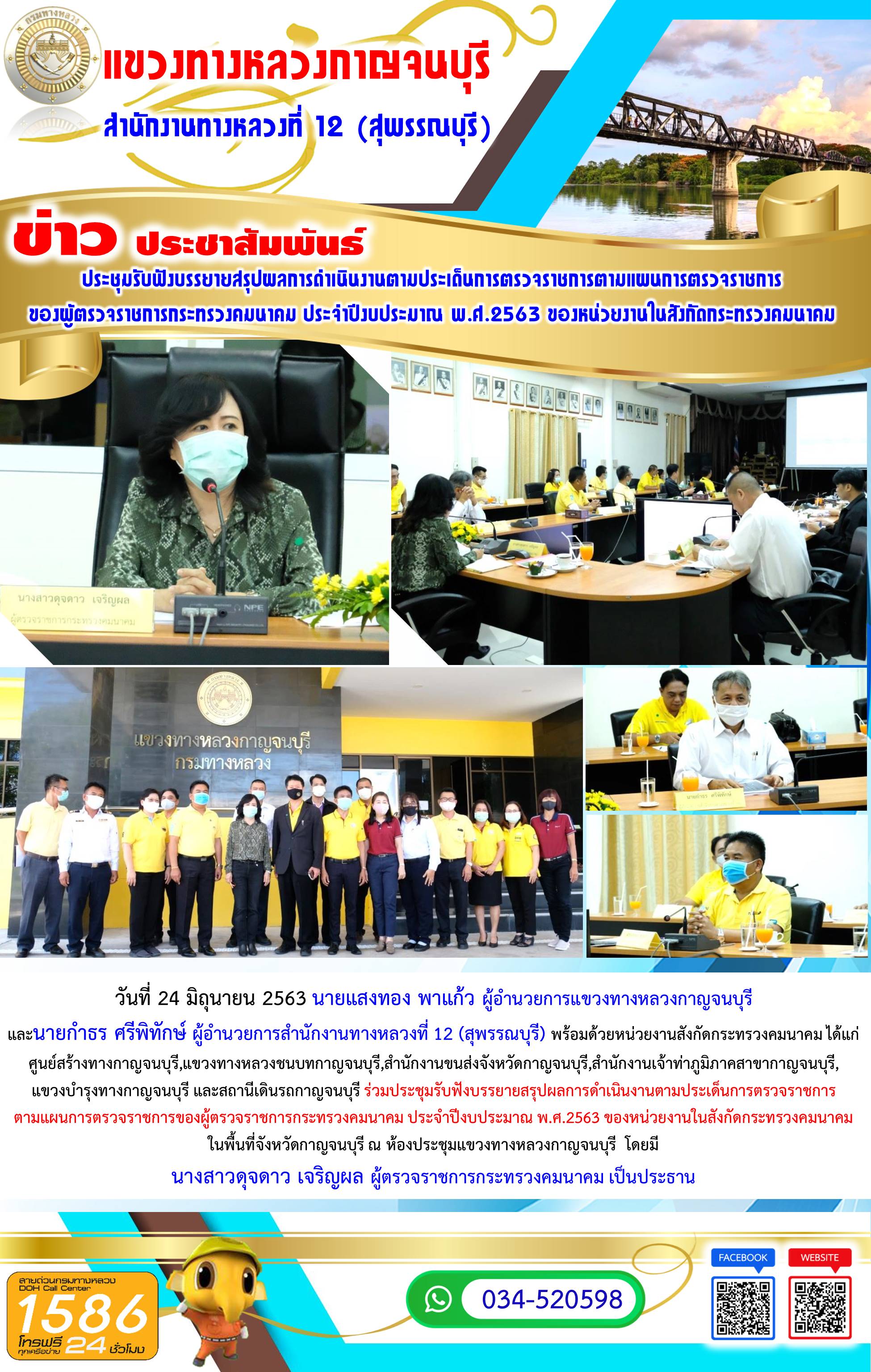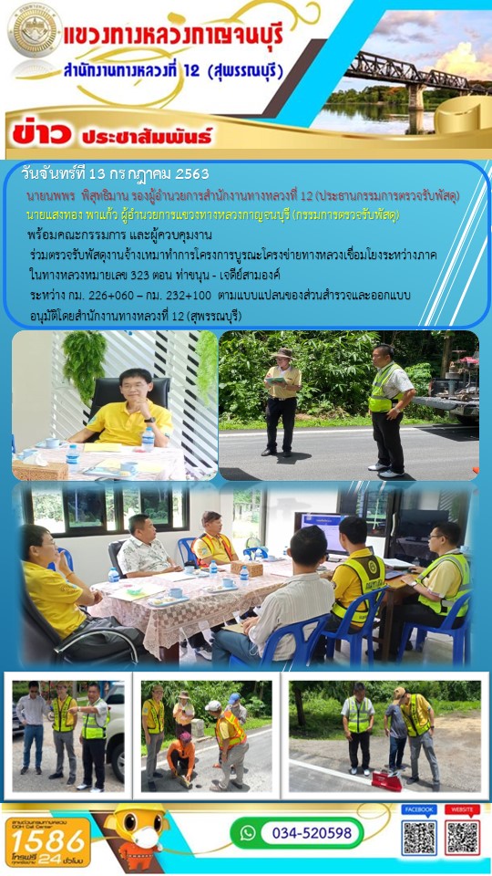 453 13/07/2563 วันจันทร์ที่ 13 กรกฎาคม 2563 นายนพพร พิสุทธิมานรองผู้อำนวยการสำนักงานที่ 12 (ประธานกรรมการตรวจรับพัสดุ) นายแสงทอง พาแก้ว ผู้อำนวยการแขวงทางหลวงกาญจนบุรี (กรรมการตรวจรับพัสดุ) พร้อมคณะกรรมการ และผู้ควบคุมงาน ร่วมตรวจรับพัสดุงานจ้างเหมาทำการโครงการบูรณะโครงข่ายทางหลวงเชื่อมโยงระหว่างภาค ในทางหลวงหมายเลข 323 ตอน ท่าขนุน - เจดีย์สามองค์ ระหว่าง กม.226+060 - กม.232+100 ตามแบบแปลนของส่วนสำรวจและออกแบบ อนุมัติโดยสำนักงานทางหลวงที่ 12 (สุพรรณบุรี)