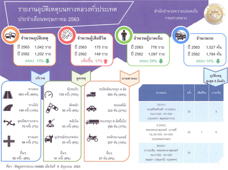 458 29/06/2563 กรมทางหลวง สรุปอุบัติเหตุบนทางหลวงเดือนพฤษภาคม 2563 อุบัติเหตุลดลง 14% พร้อมขอความร่วมมือปฏิบัติตามกฎจราจร