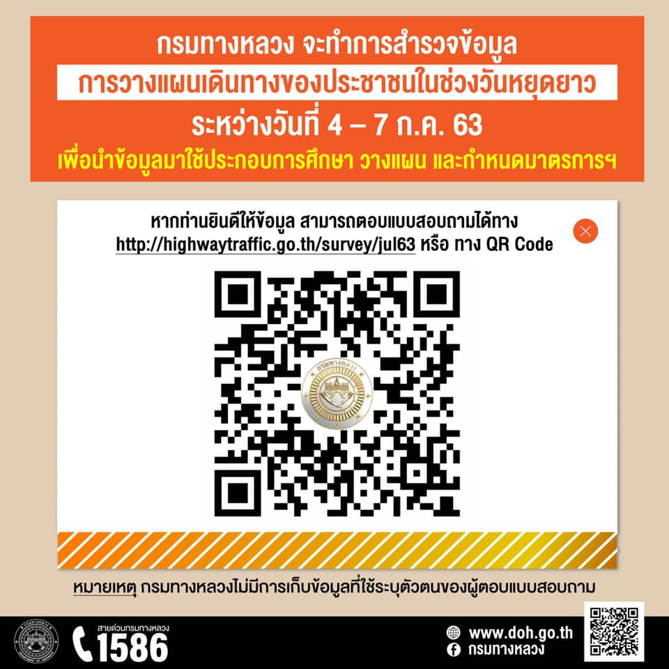 457 01/07/2563 กรมทางหลวงขอเชิญชวนประชาชนรวมทำแบบสำรวจข้อมูลการวางแผนเดินทางของประชาชน ในช่วงวันหยุดยาวระหว่างวันที่4-7 ก.ค. 63