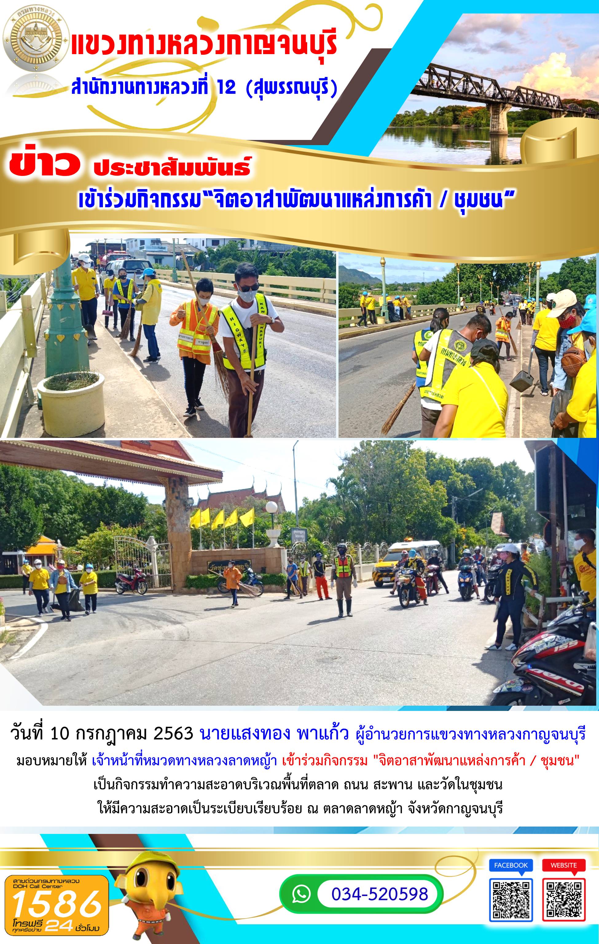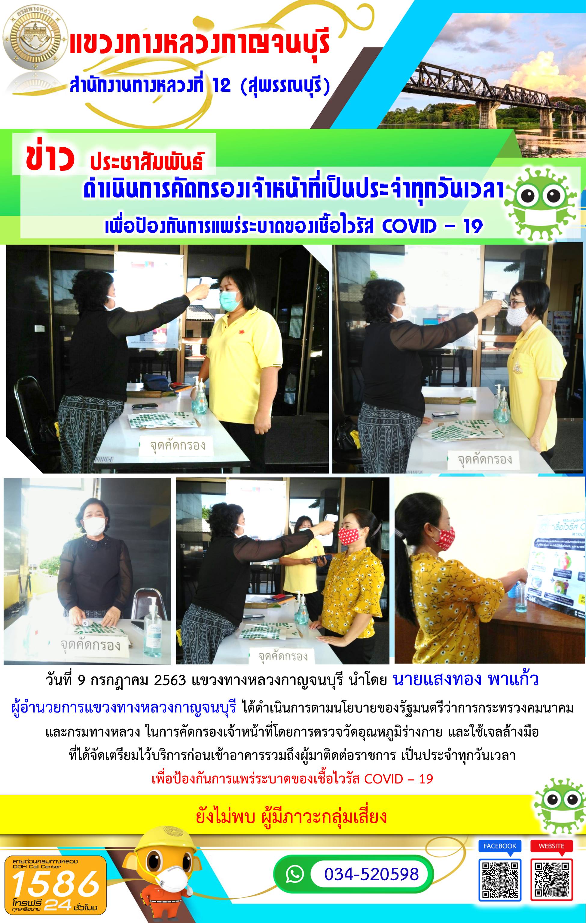 456 08/07/2563 วันที่ 8 กรกฎาคม 2563 แขวงทางหลวงกาญจนบุรี นำโดย นายแสงทอง พาแก้ว ผู้อำนวยการแขวงทางหลวงกาญจนบุรี ได้ดำเนินการตามนโยบายของรัฐมนตรีว่าการกระทรวงคมนาคมและกรมทางหลวง ในการคัดกรองเจ้าหน้าที่โดยการตรวจวัดอุณหภูมิร่างกาย และใช้เจลล้างมือที่ได้จัดเตรียมไว้บริการก่อนเข้าอาคารรวมถึงผู้มาติดต่อราชการ เพื่อป้องกันการแพร่ระบาดของเชื้อไวรัส COVID – 19