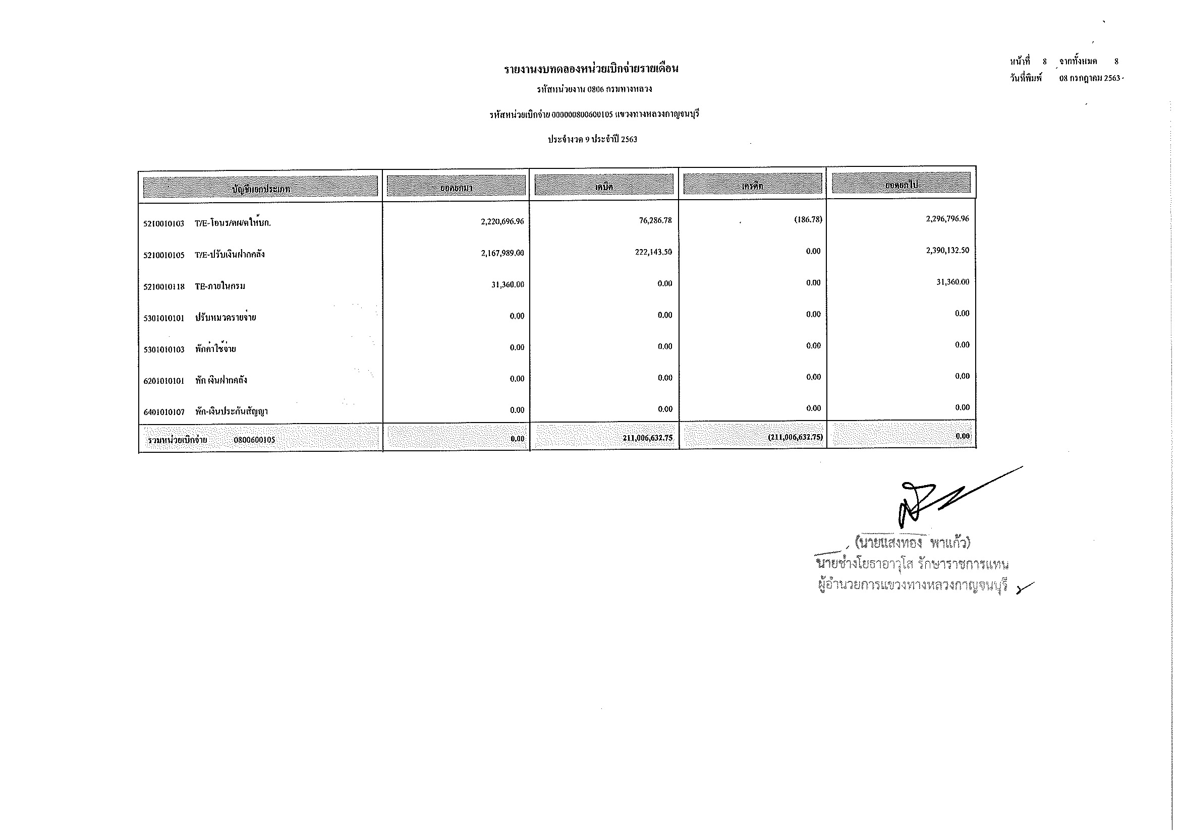 452 14/07/2563 รายงานงบทดลองหน่วยเบิกจ่ายรายเดือน ประจำงวด 9 ประจำปีที่ 2563